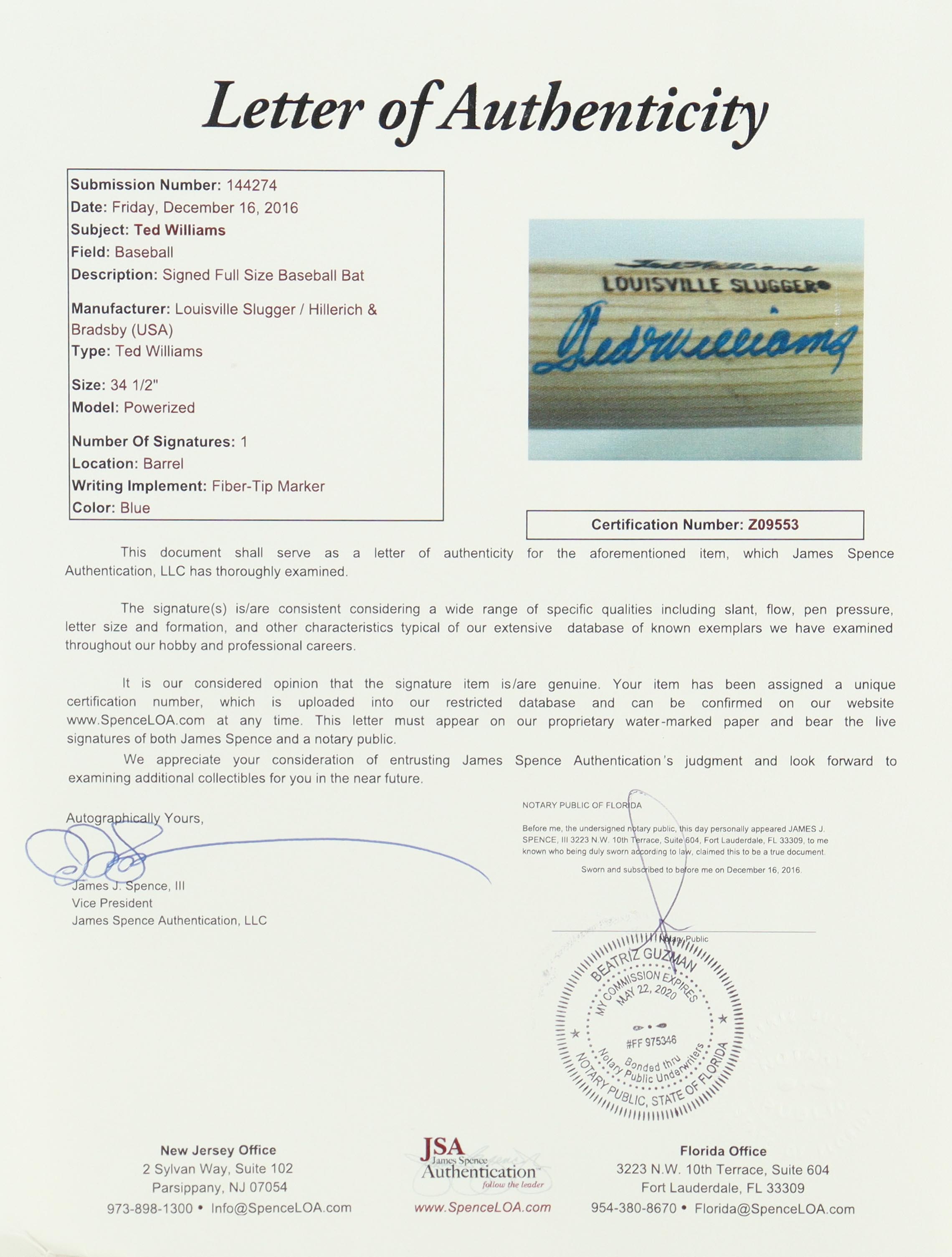 Ted Williams Signed Louisville Slugger Baseball Bat (JSA & Williams)