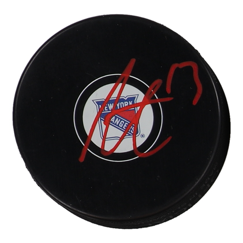 New York Rangers logo hockey puck. Hand-signed by Mika Zibanejad.