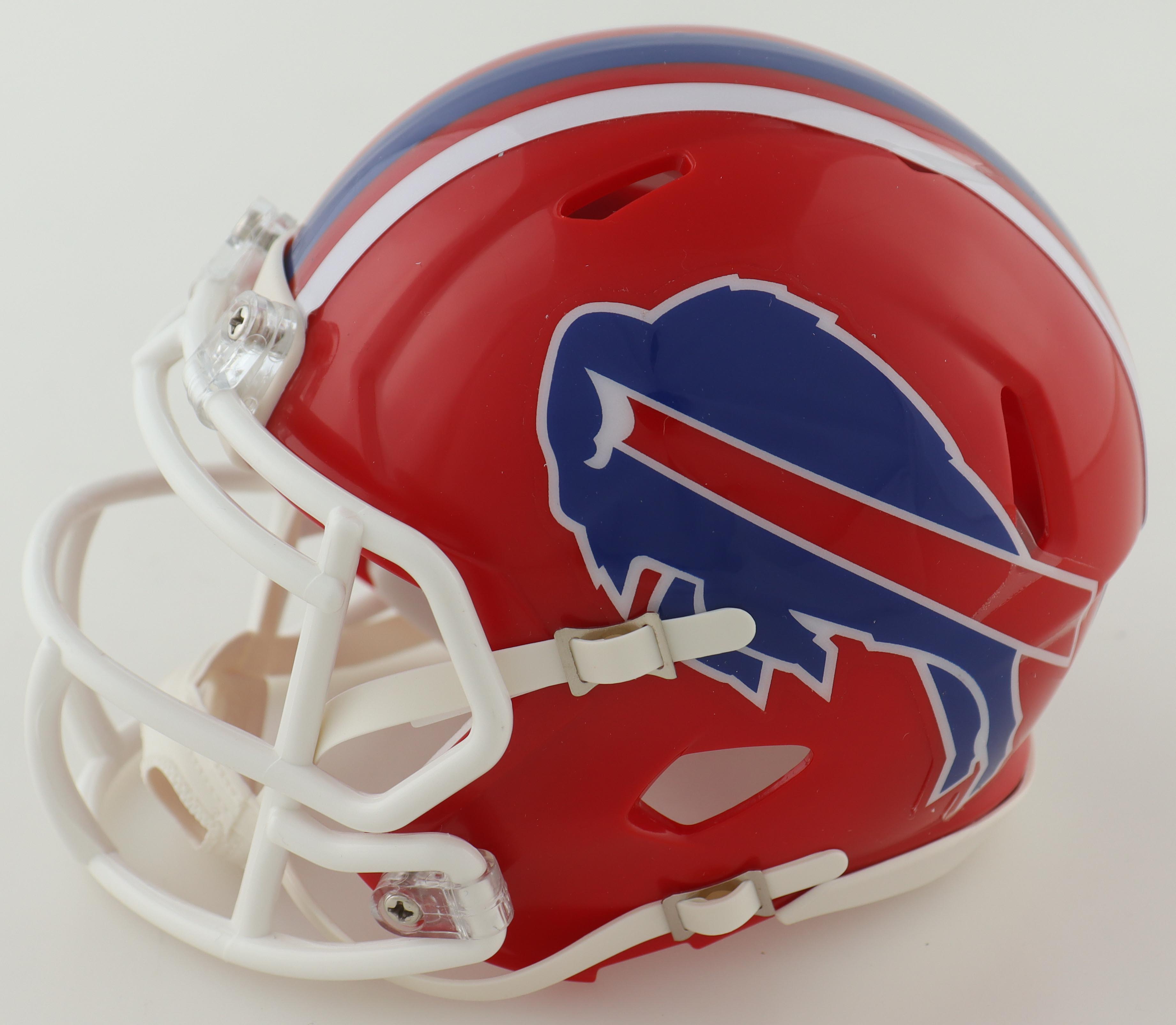 Riddell Buffalo Bills Throwback mini helmet has been hand-signed by Andre Reed (HOF), Jim Kelly (HOF), and Thurman Thomas (HOF).