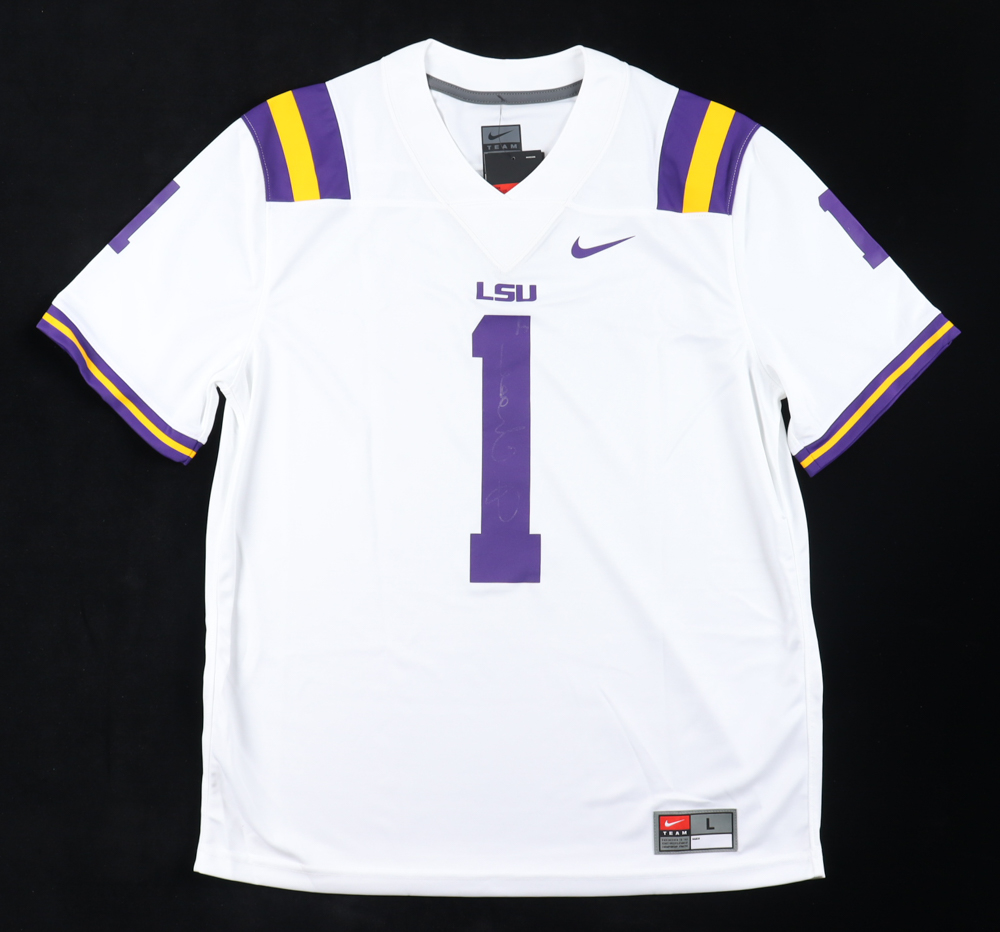 Nike jersey. Everything is printed on, size L. Hand-signed by Ja'Marr Chase (LSU Tigers). Please note, there are ink stains on the front number.