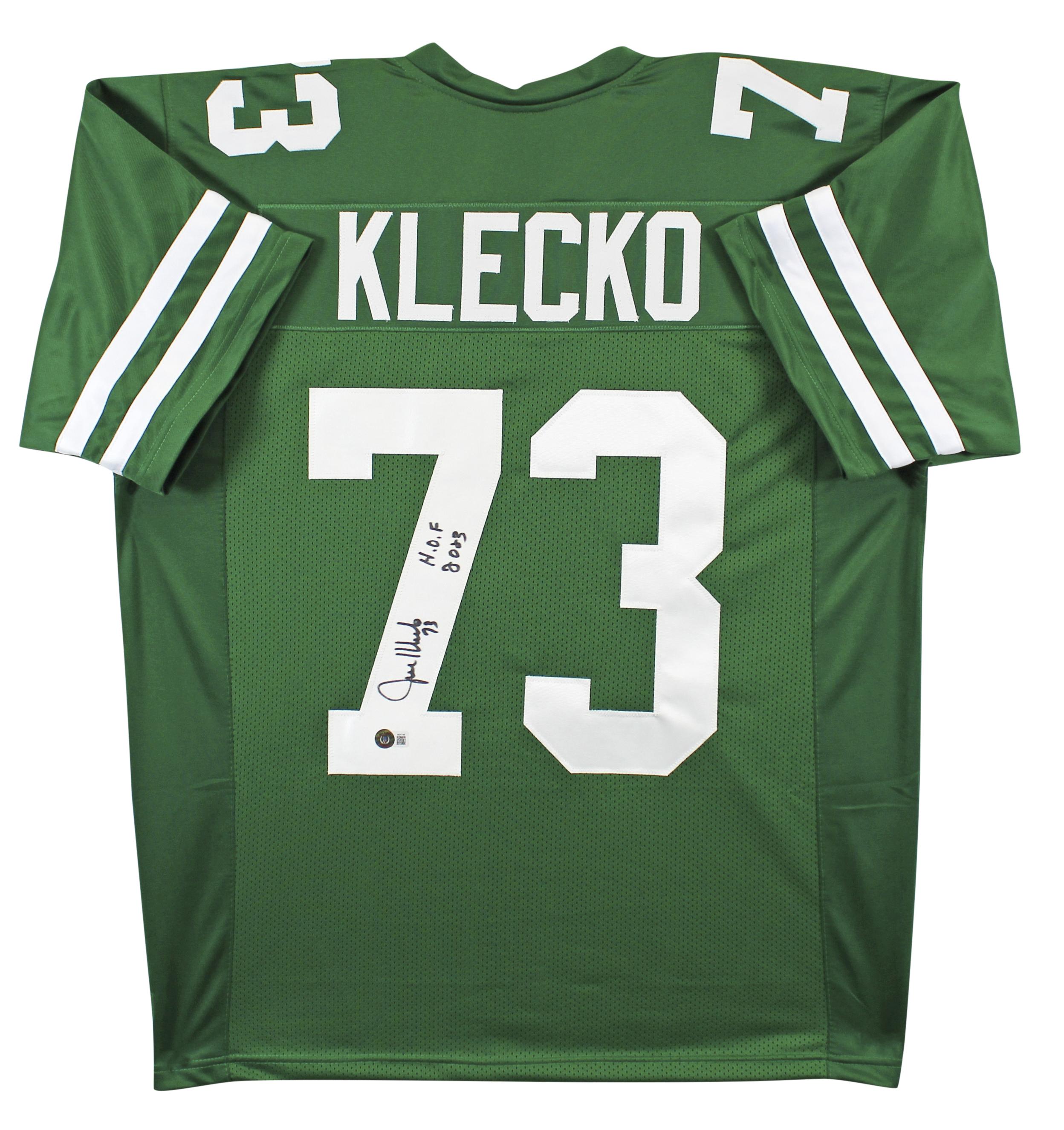 Custom jersey. Everything is sewn on, size XL. Hand-signed and inscribed by Joe Klecko (HOF).