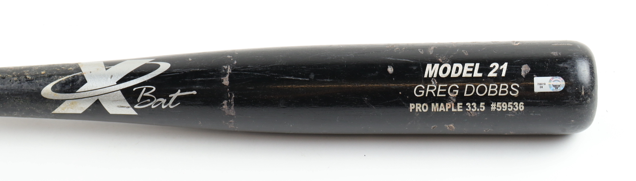 Player Model baseball bat. The bat has been game-used and cracked by Mike Adams (San Diego Padres) and shows associated scuffing and wear. Please see photos for details regarding the condition of the bat.