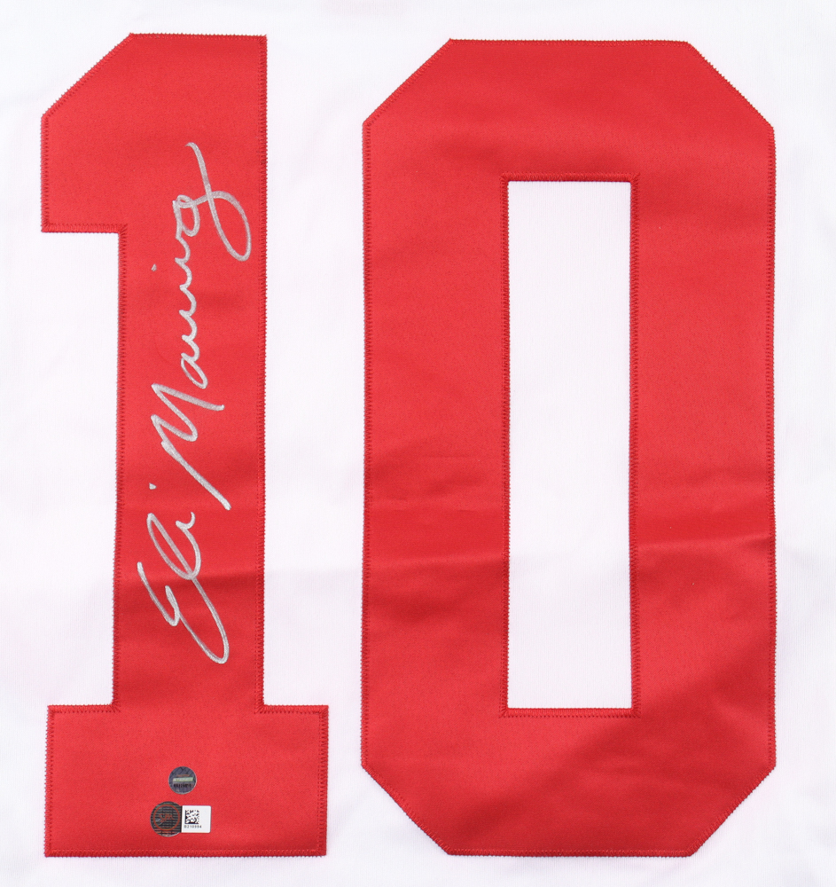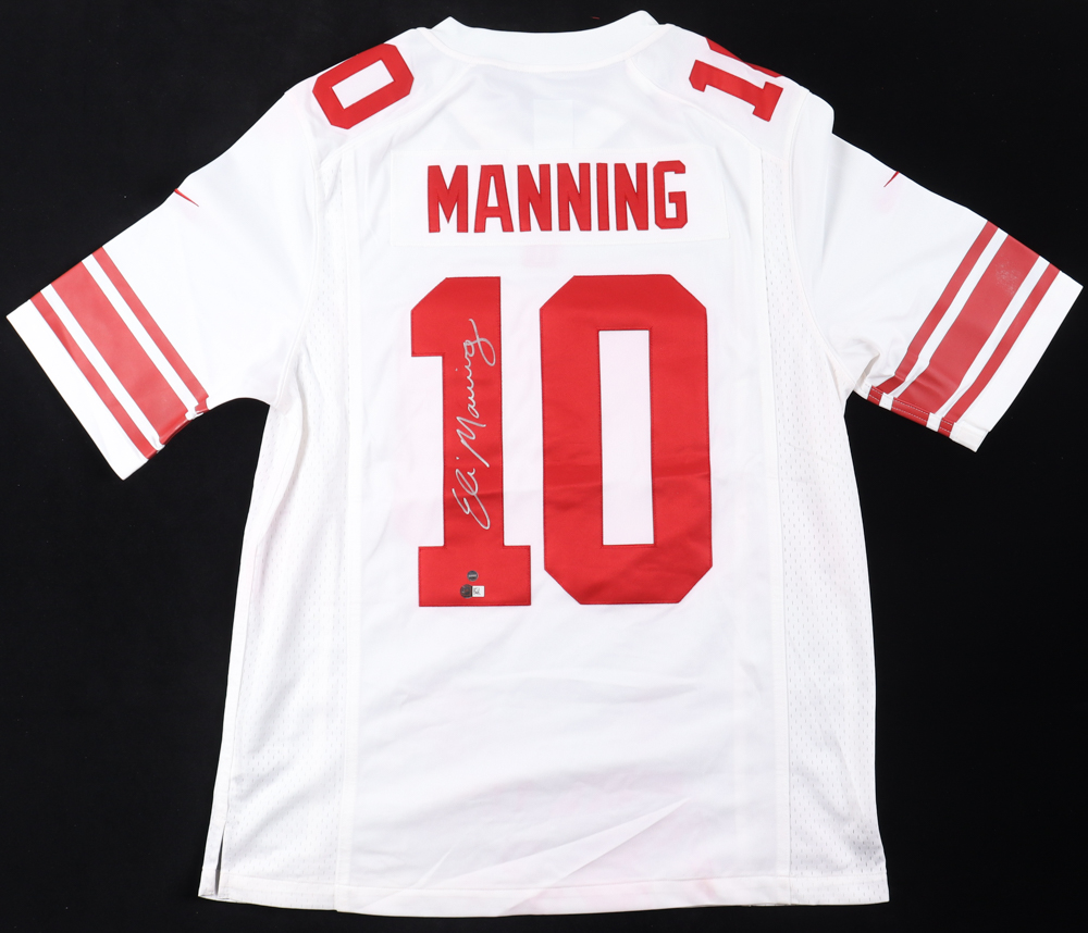 Nike jersey. Everything sewn on, size L. Hand-signed by Eli Manning (New York Giants). Please note, there are red stains on the front and back of the jersey.
