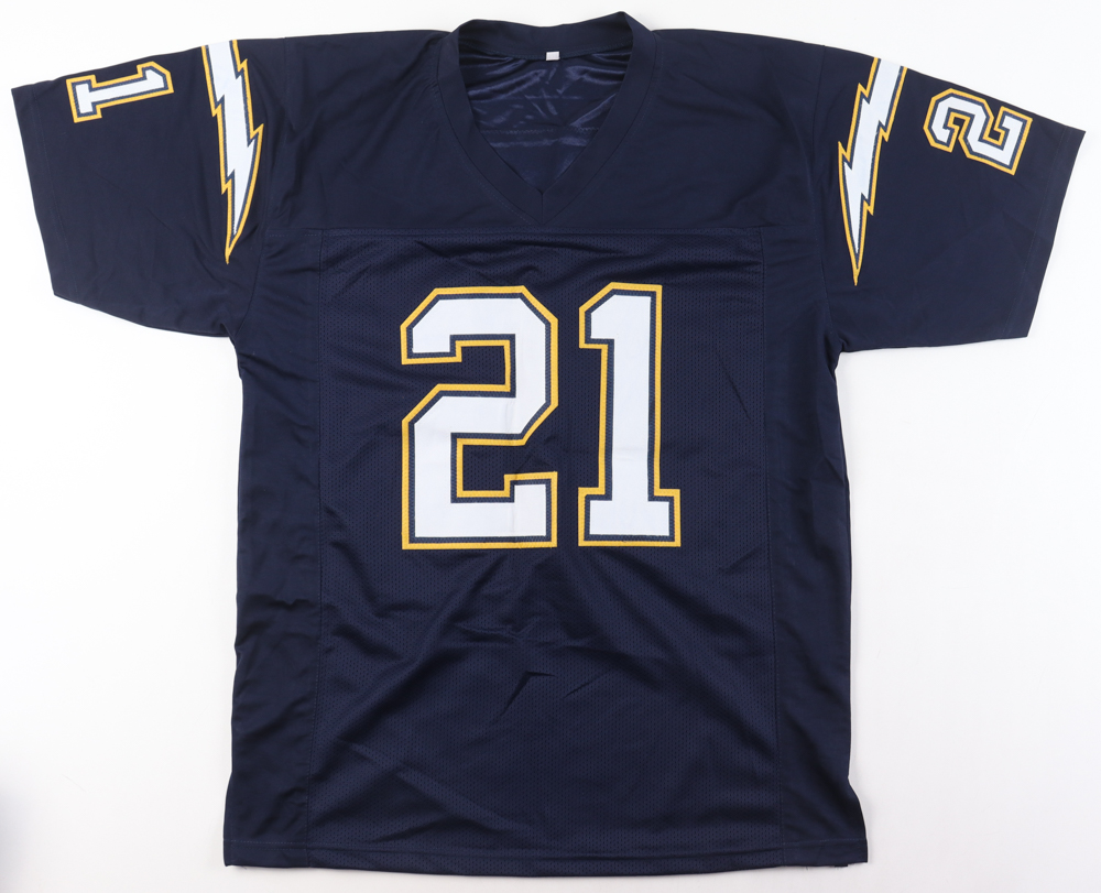 Custom jersey. Everything sewn on, size XL. Hand-signed and inscribed by LaDainian Tomlinson (HOF). Please note, there are stains on the reverse number.