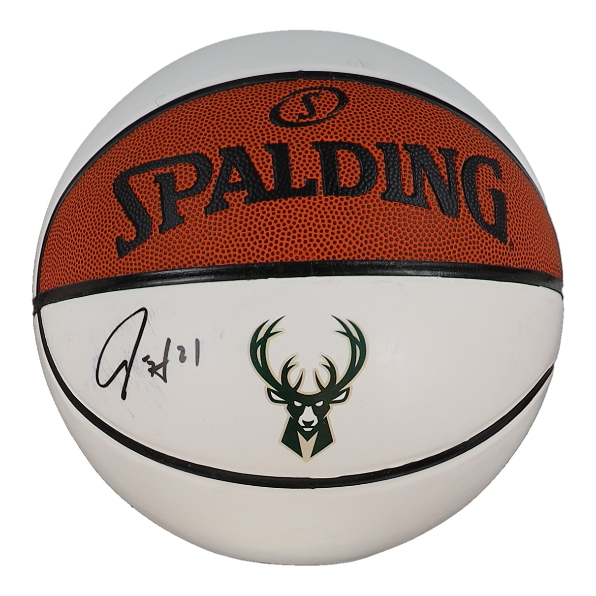 Spalding Milwaukee Bucks logo NBA basketball. Hand-signed by Jrue Holiday. Please note, signature has smudged.