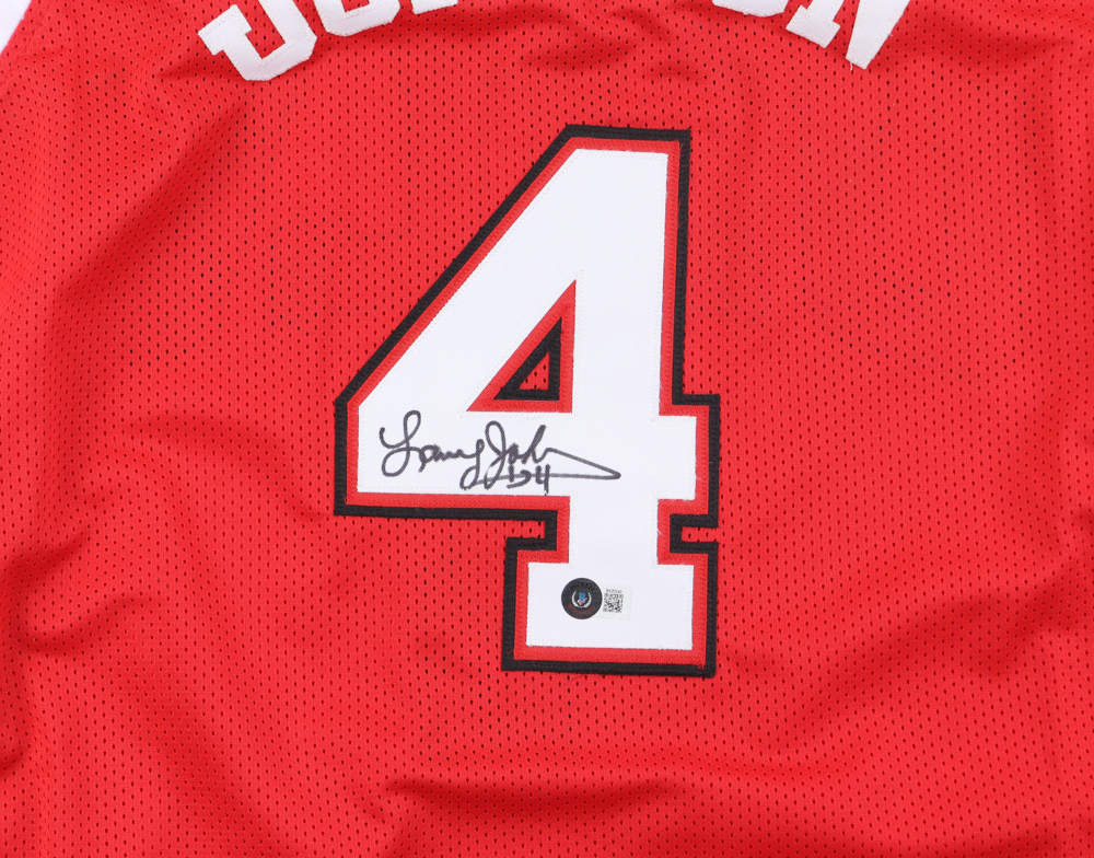 Custom jersey. Everything is sewn on, size L. Hand-signed and inscribed by Larry Johnson.