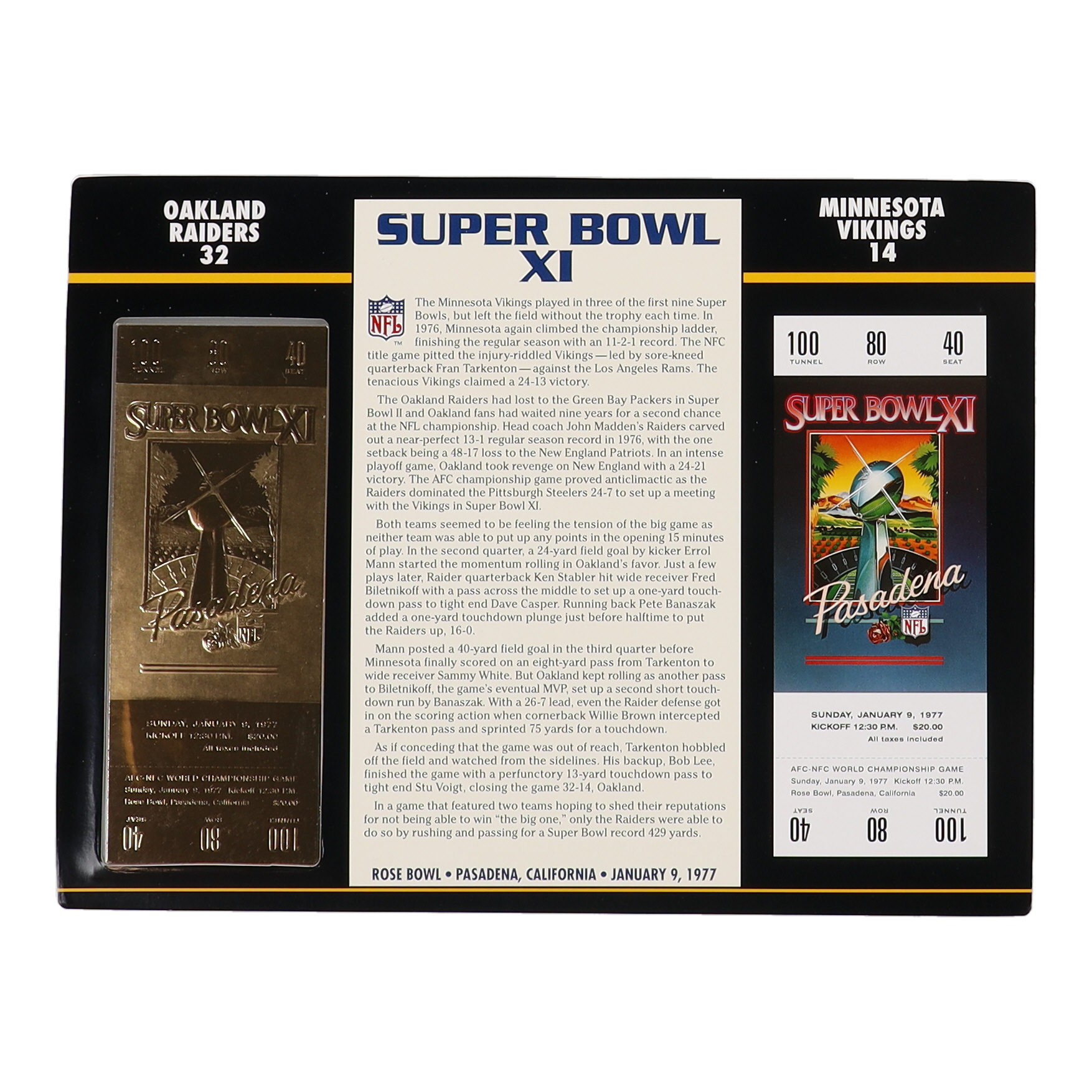 1977 Commemorative Super Bowl XI Card with 22KT Gold Ticket: Raiders vs Vikings