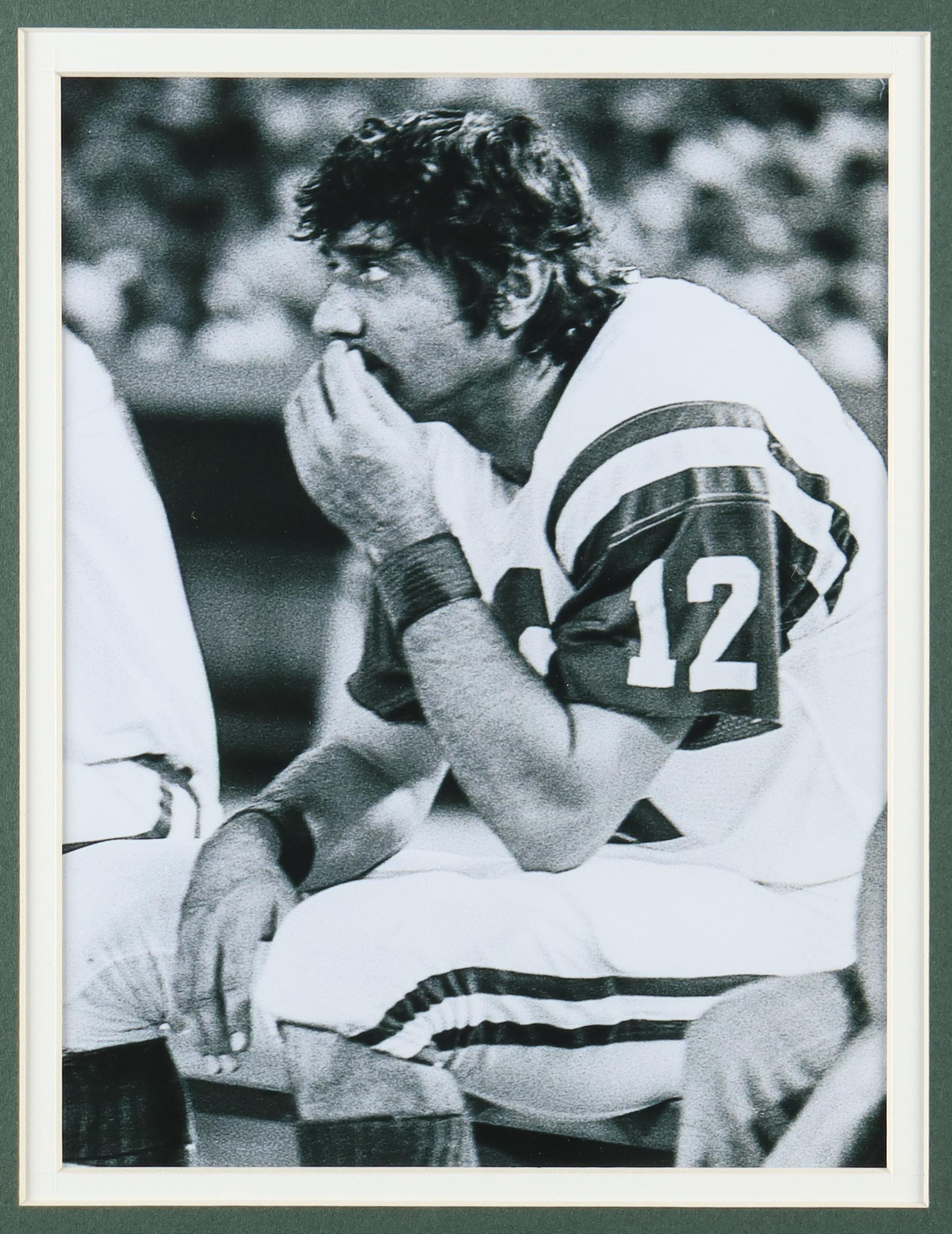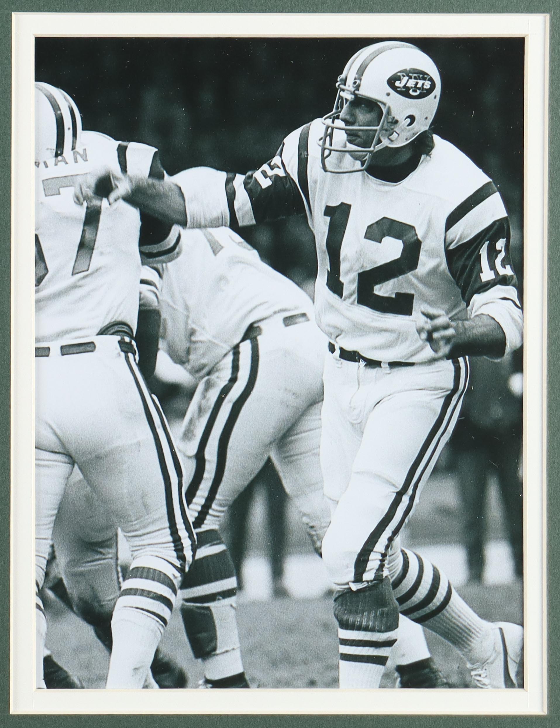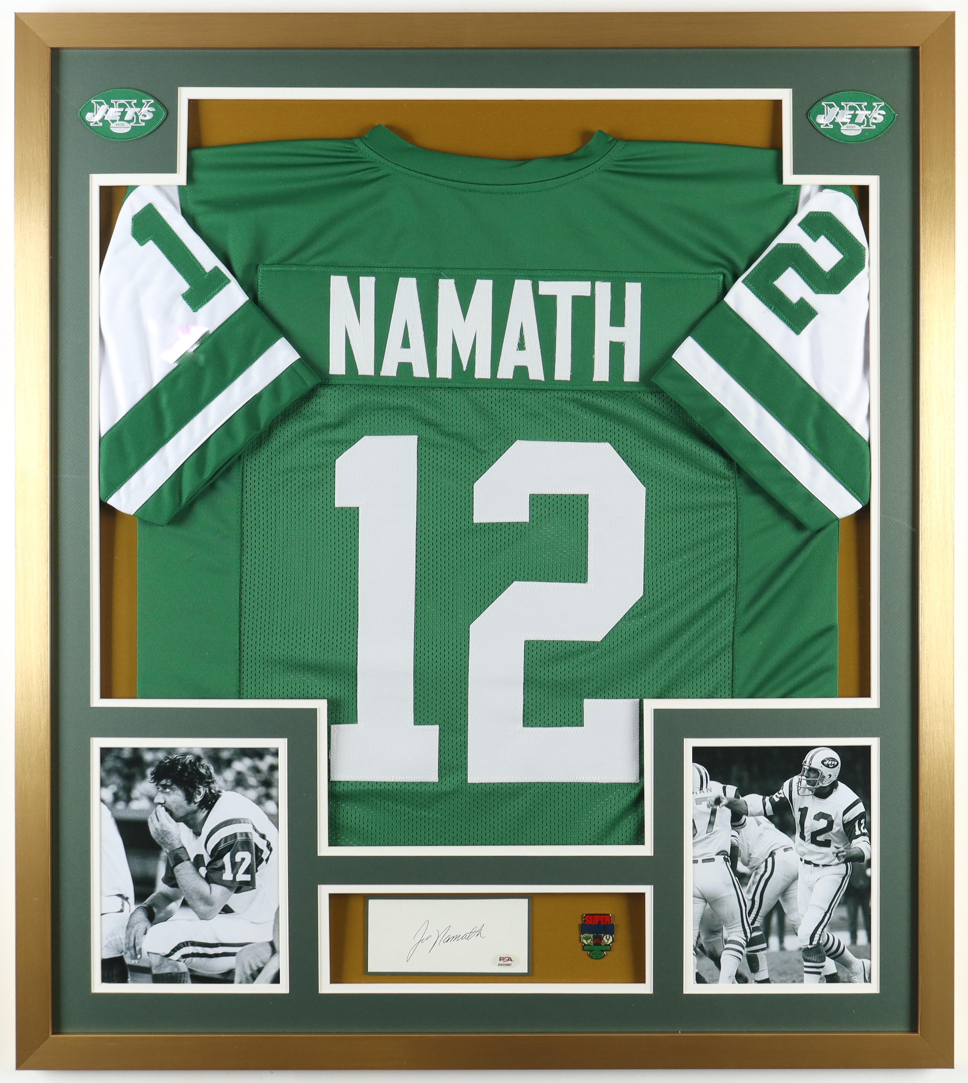Custom frame measures 32" x 36" in size and features a cut that has been hand-signed by Joe Namath (New York Jets, HOF). Includes a green jersey, (2) 8" x 10" photos and an official Super Bowl III vintage pin.