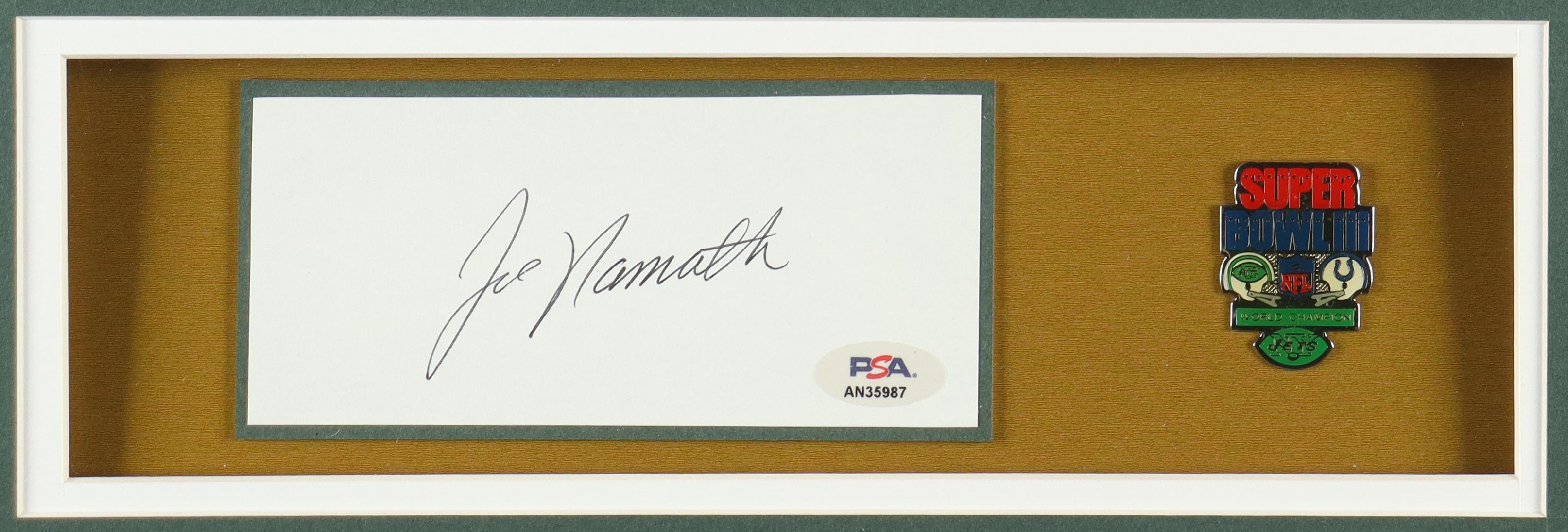 Joe Namath Signed Custom Framed Cut Display With Jersey & Official Super Bowl III Vintage Pin (PSA)