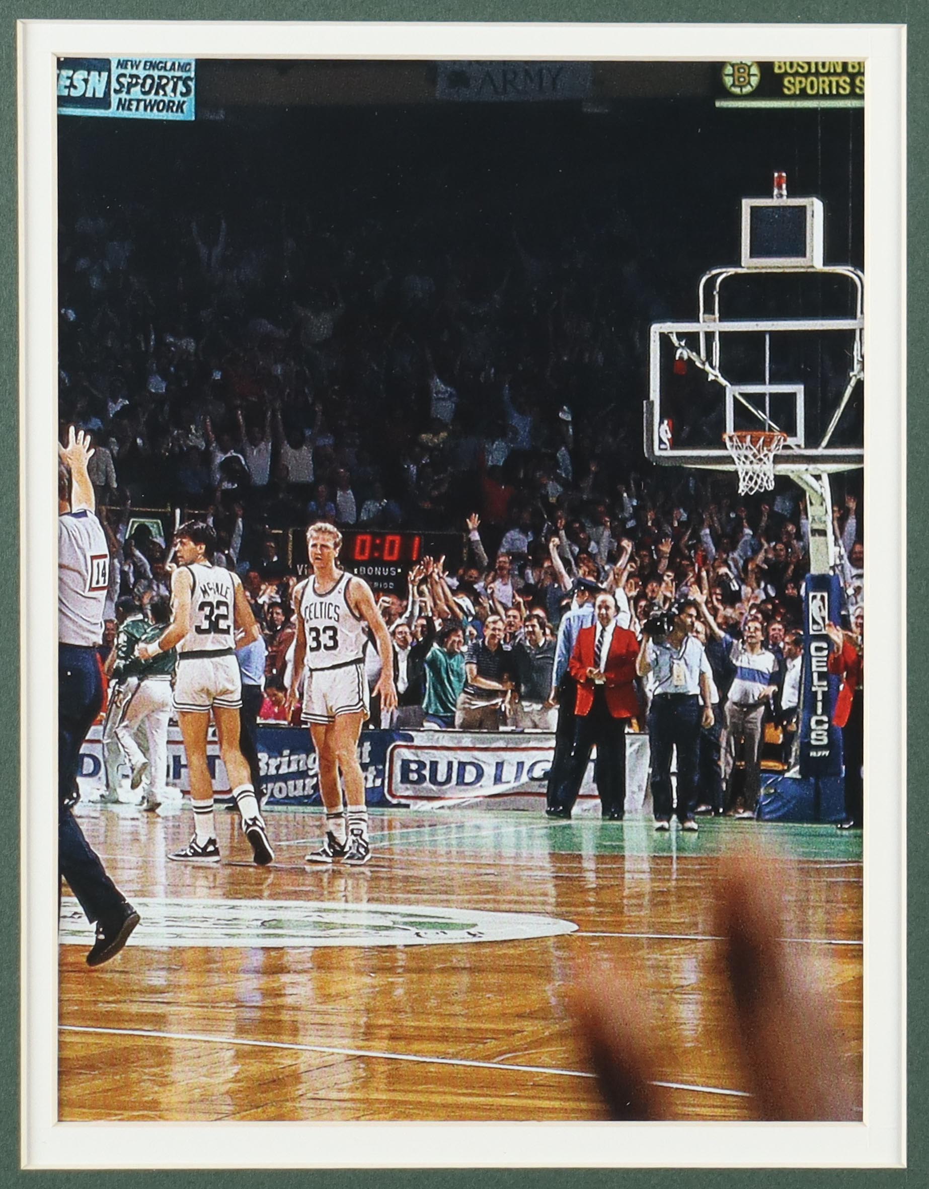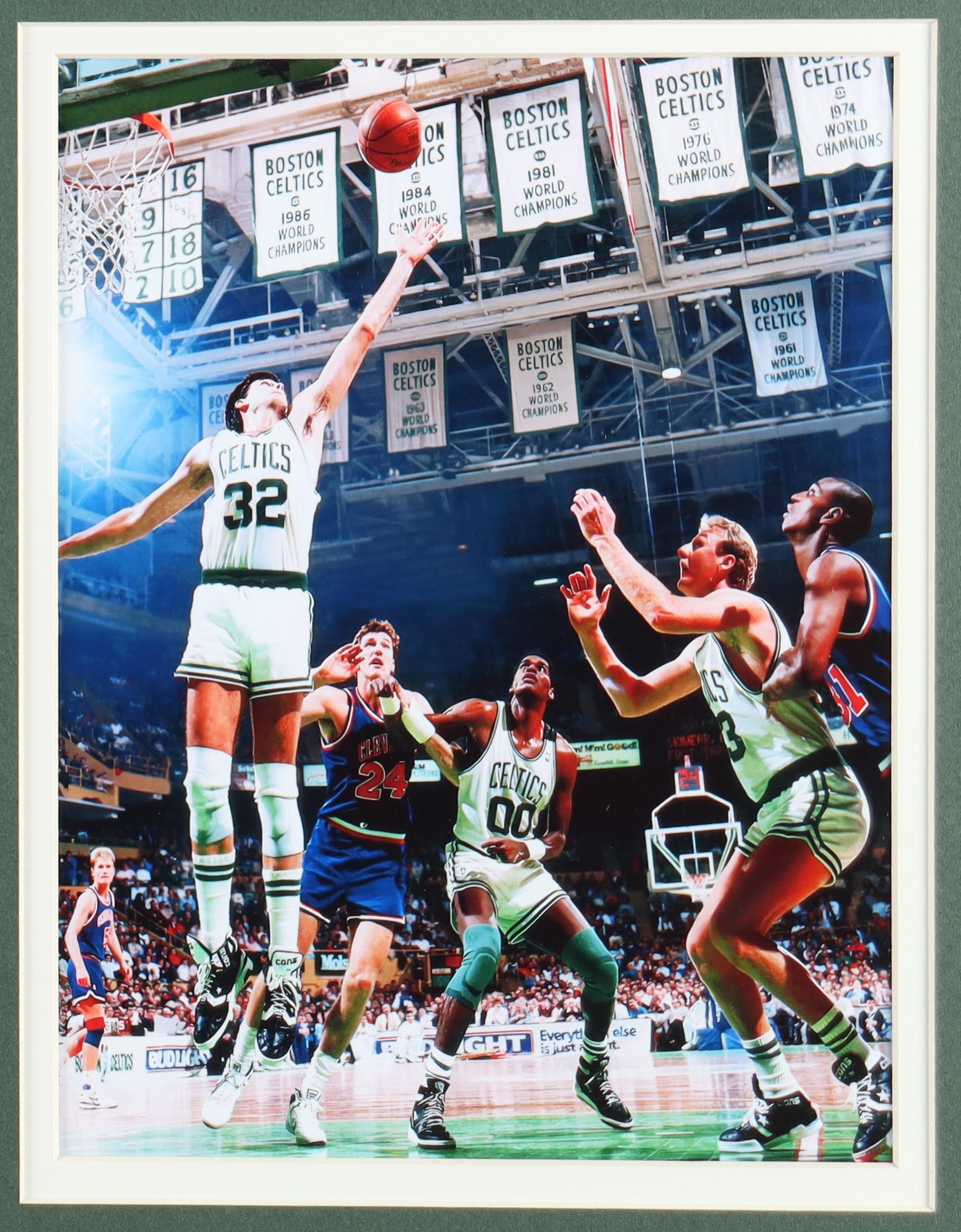 Custom Framed Jersey Display measures 32" x 36" in size and has been hand-signed by Larry Bird (HOF), Tiny Archibald, M.L. Carr, Chris Ford (D. 2023), Gerald Henderson, Cedric Maxwell, & Rick Robey. Display also features a Boston Celtics pin, (2) 8" x 10" photos and (2) Celtics cloth patches.