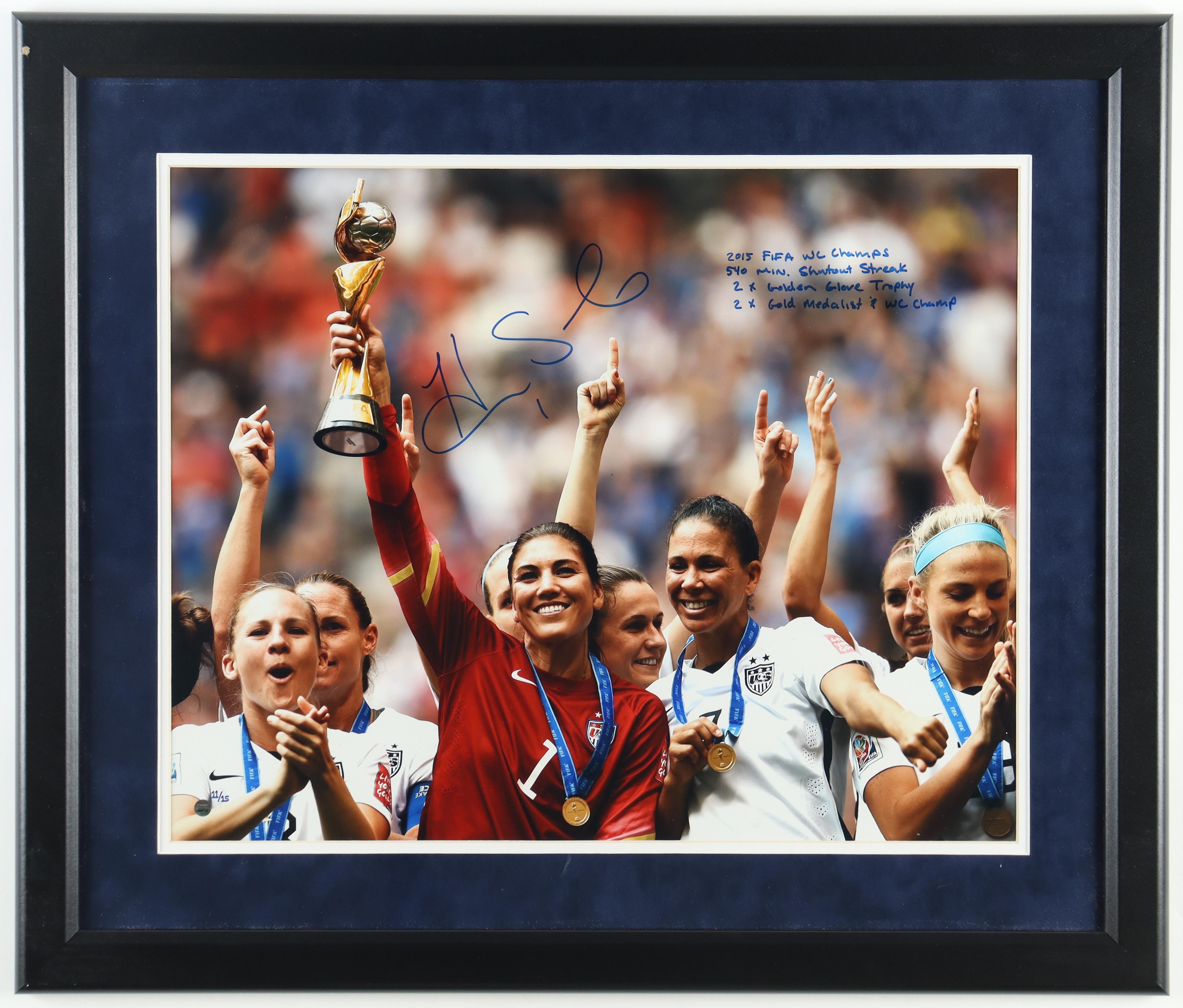 Custom frame measures approximately 22.5" x 26.5" in size and features a photo that has been hand-signed and inscribed by Hope Solo. The photo is limited edition and has been numbered #11/15. Please note, there is slight scuffing on the frame.