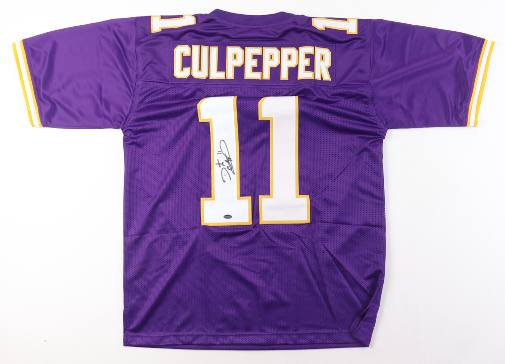 Custom jersey. Everything sewn on, size L. Hand-signed by Daunte Culpepper.
