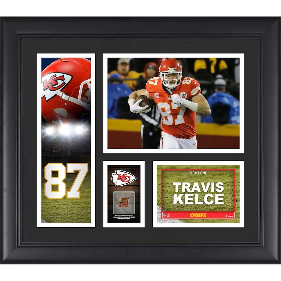 Custom frame measures 15" x 17" in size and features a piece of a football used in-game by the Kansas City Chiefs, affixed to a photo of Travis Kelce.
