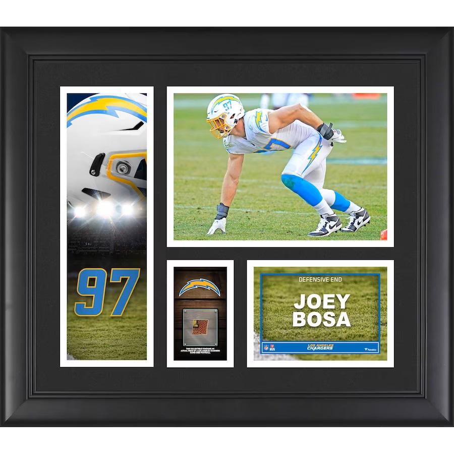 Custom frame measures 15" x 17" in size and features a piece of a football used in-game by the Los Angeles Chargers, affixed to a photo of Joey Bosa.