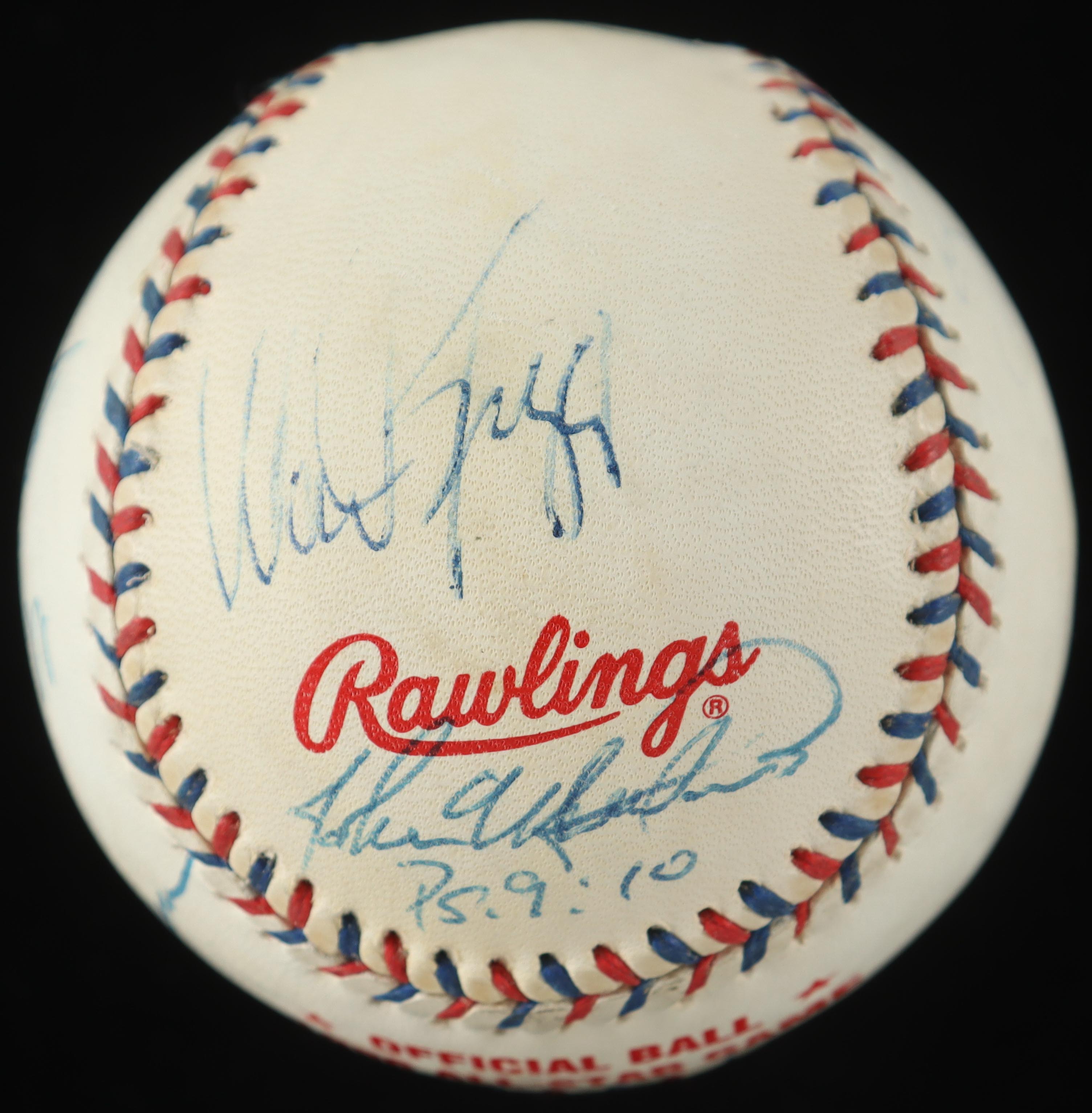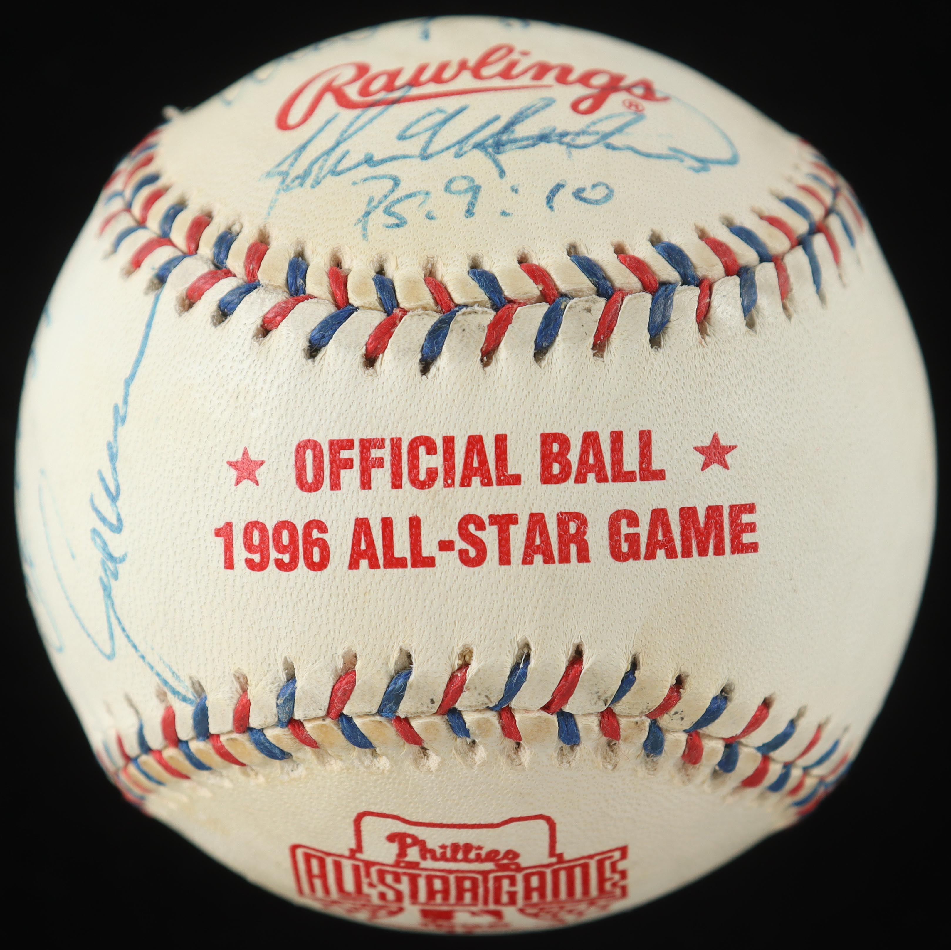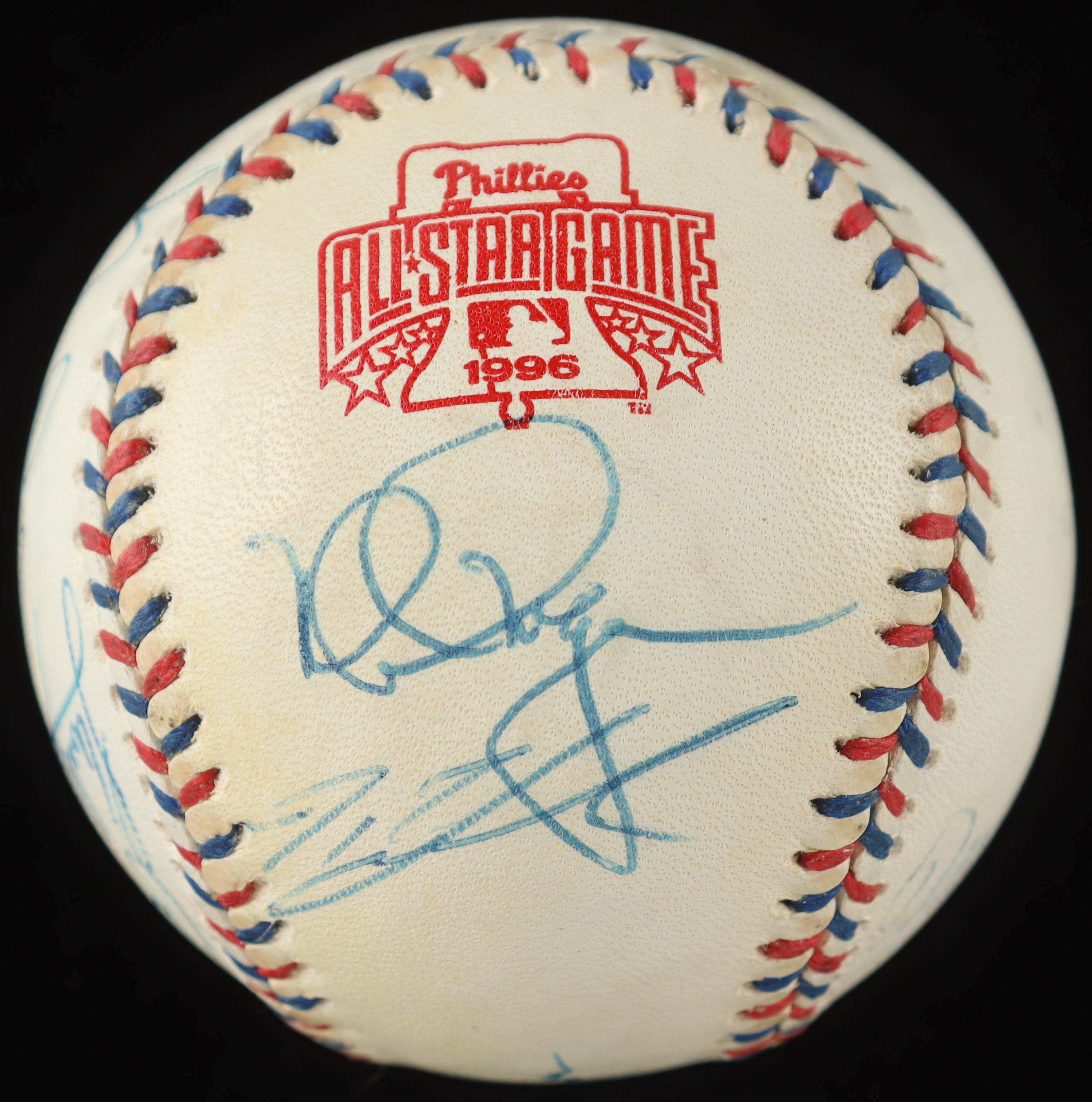 Rawlings Official 1996 All-Star Game Baseball. Hand-signed by the Sandy Alomar Jr., Joe Carter, Brady Anderson, Mark McGwire, Ivan Rodriguez, Wade Boggs & (5) others. Display case included as as shown. Please note, baseball is naturally toned and some signatures have faded. Refer to photos for more details on the condition of the item.