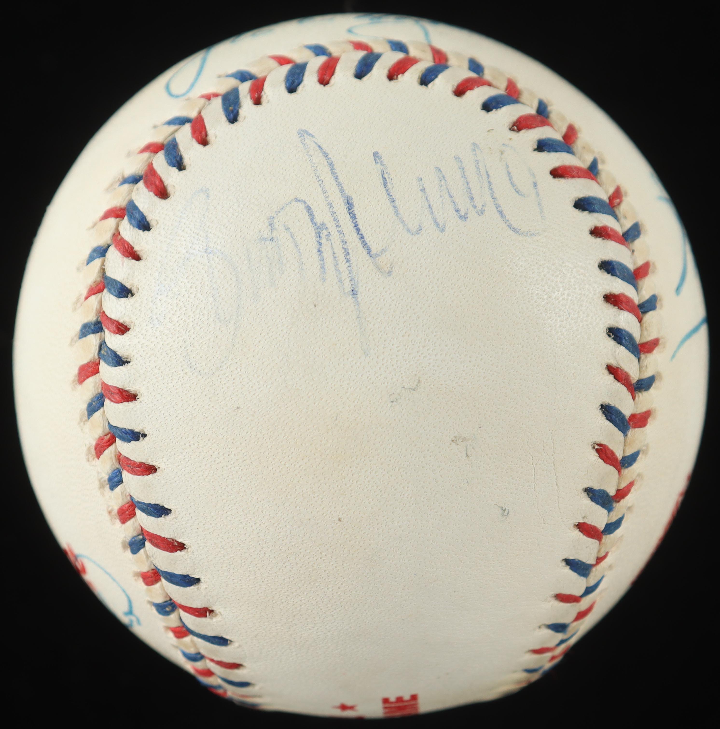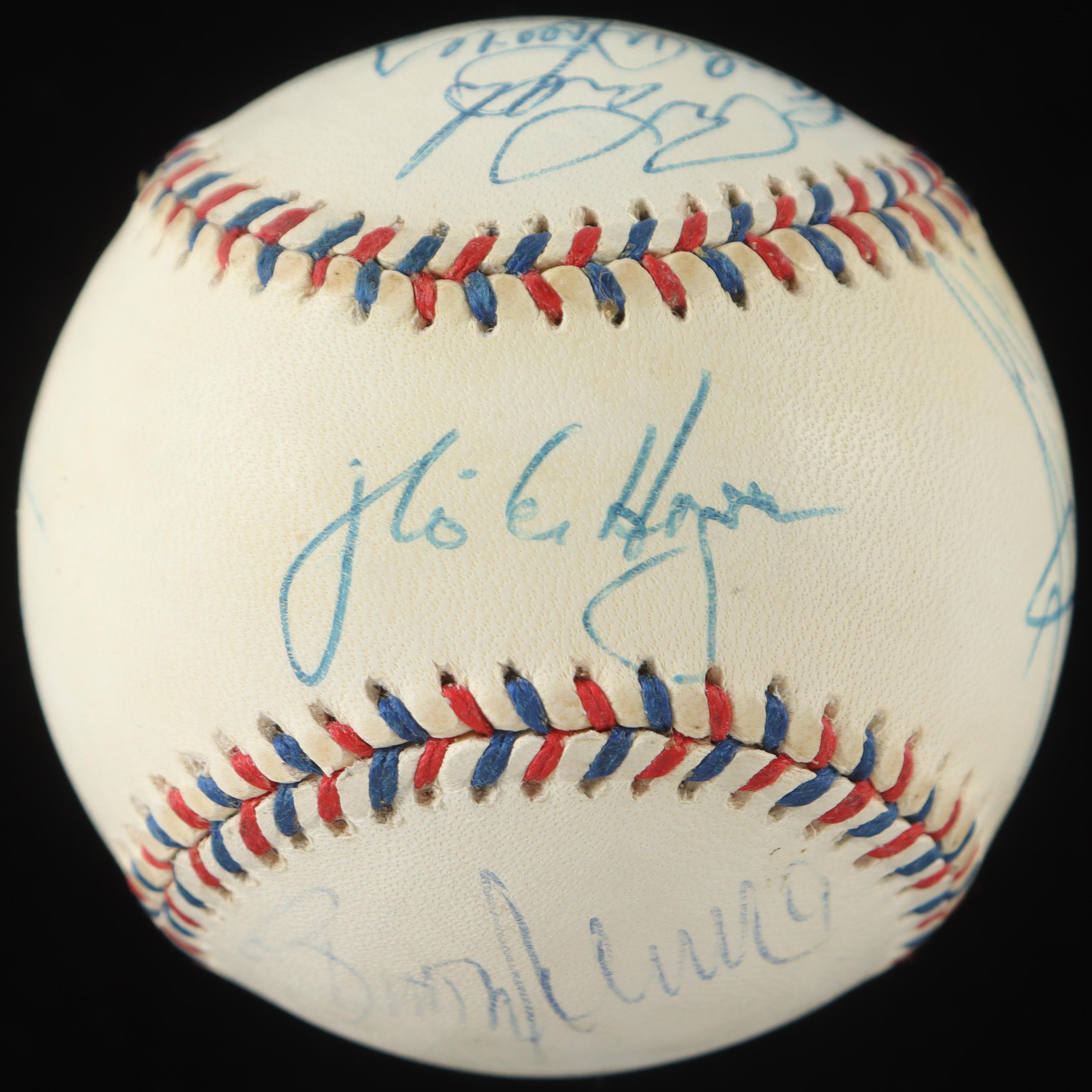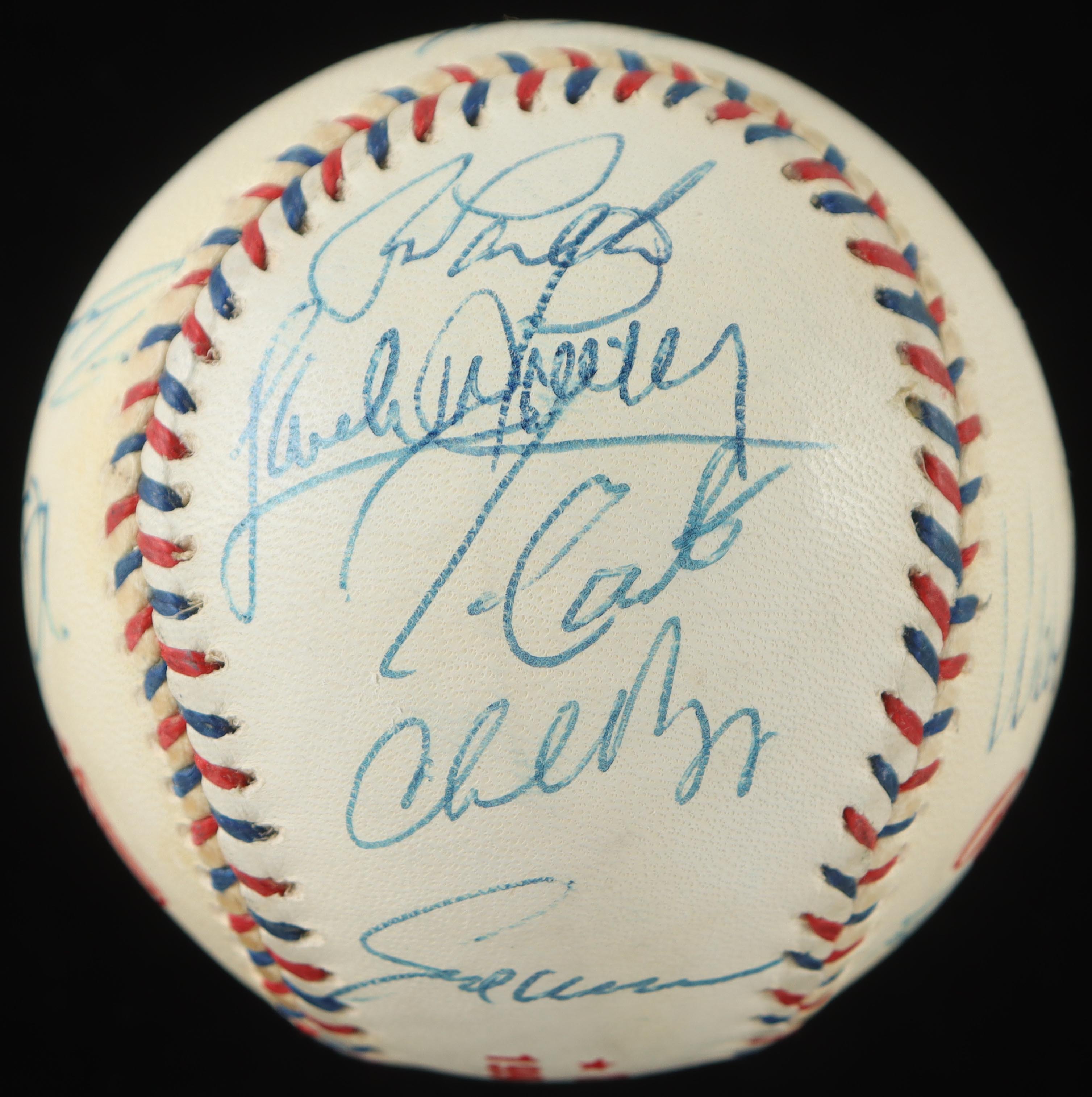Rawlings Official 1996 All-Star Game Baseball. Hand-signed by the Sandy Alomar Jr., Joe Carter, Brady Anderson, Mark McGwire, Ivan Rodriguez, Wade Boggs & (5) others. Display case included as as shown. Please note, baseball is naturally toned and some signatures have faded. Refer to photos for more details on the condition of the item.