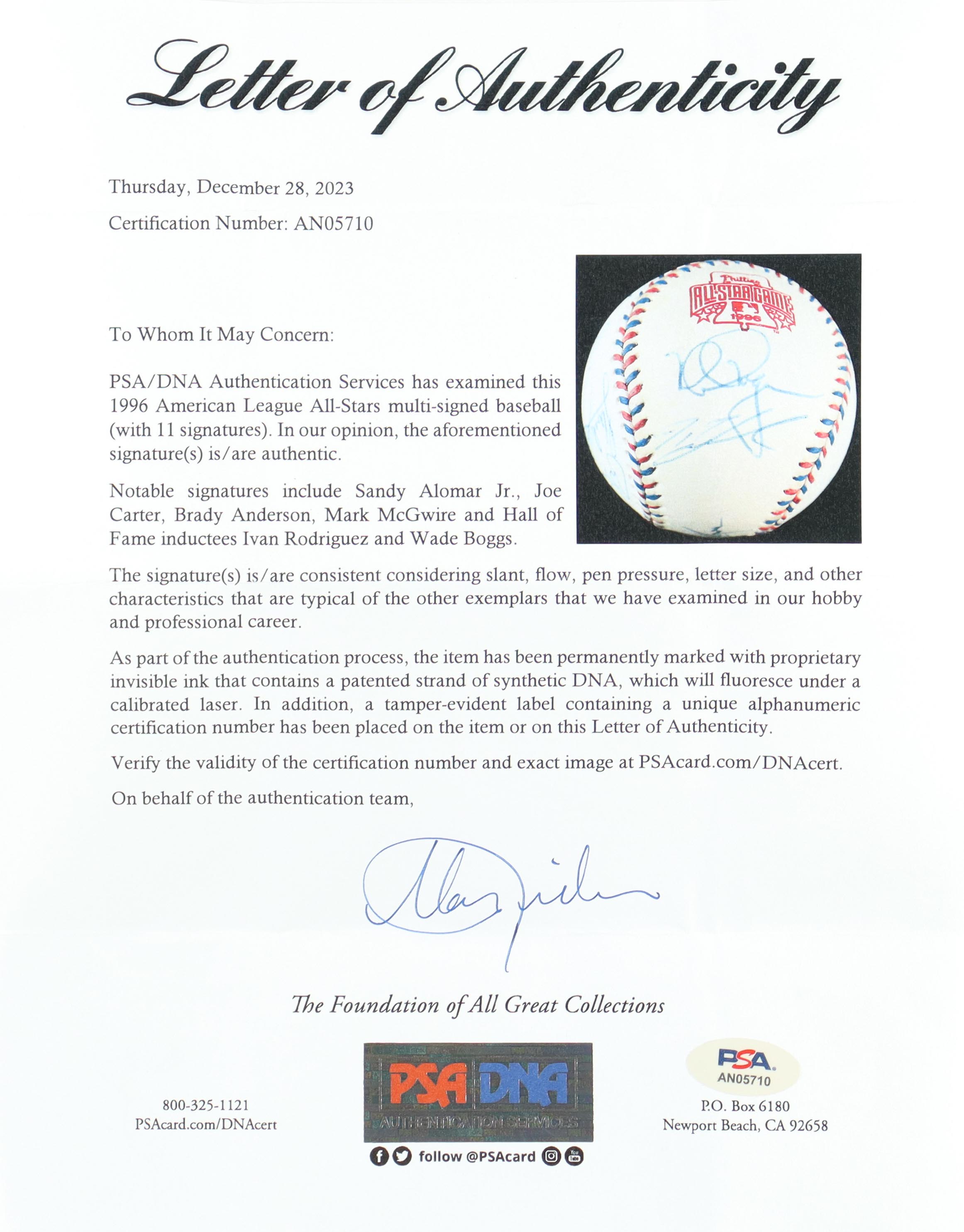 1996 American League All-Stars (11) Signed 1996 All-Star Game Baseball With Sandy Alomar Jr., Joe Carter, Brady Anderson & Mark McGwire (PSA)