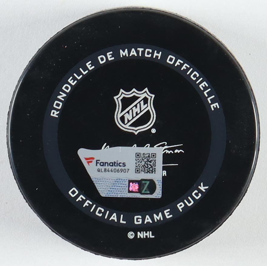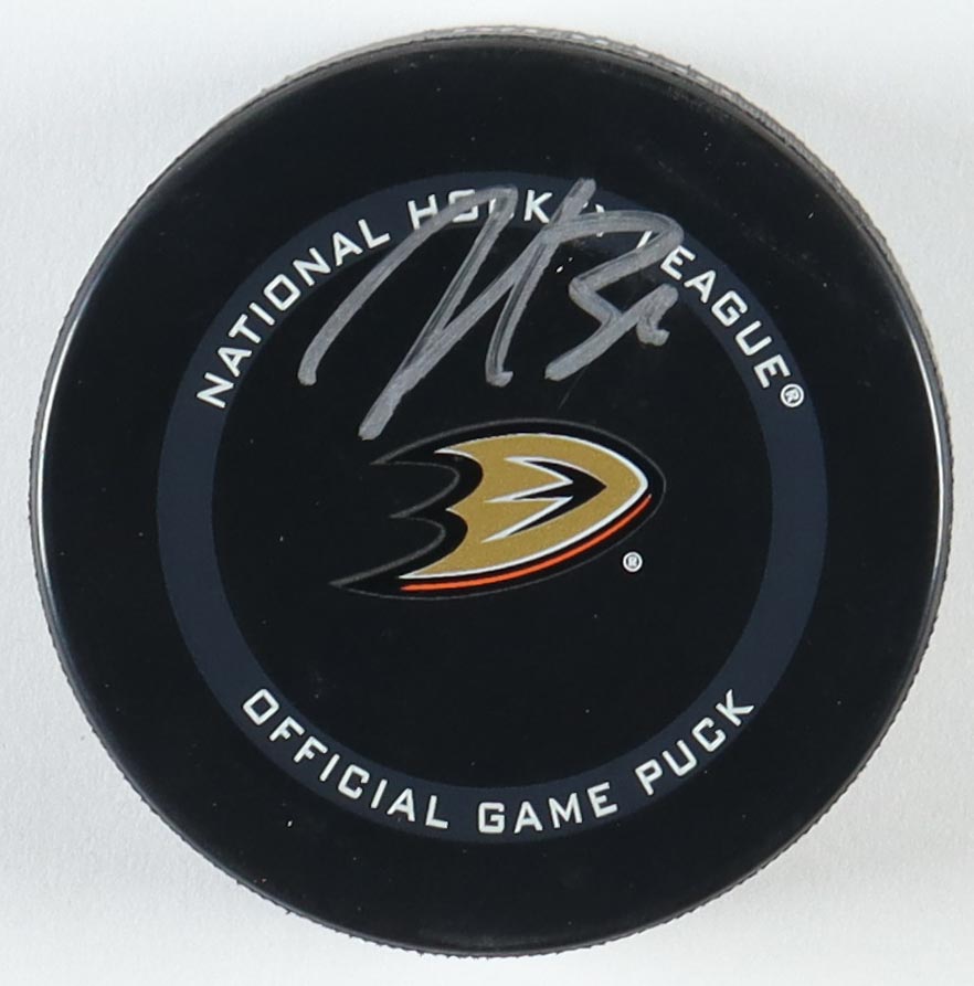 Anaheim Ducks logo hockey puck. Hand-signed by John Gibson.