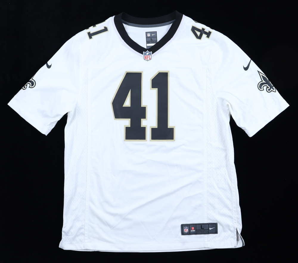 Nike jersey. Everything printed on, size L. Hand-signed by Alvin Kamara (New Orleans Saints). Please note, there are stains on the front and back of the jersey and the signature is smudged. Please see the photos for condition of the item.