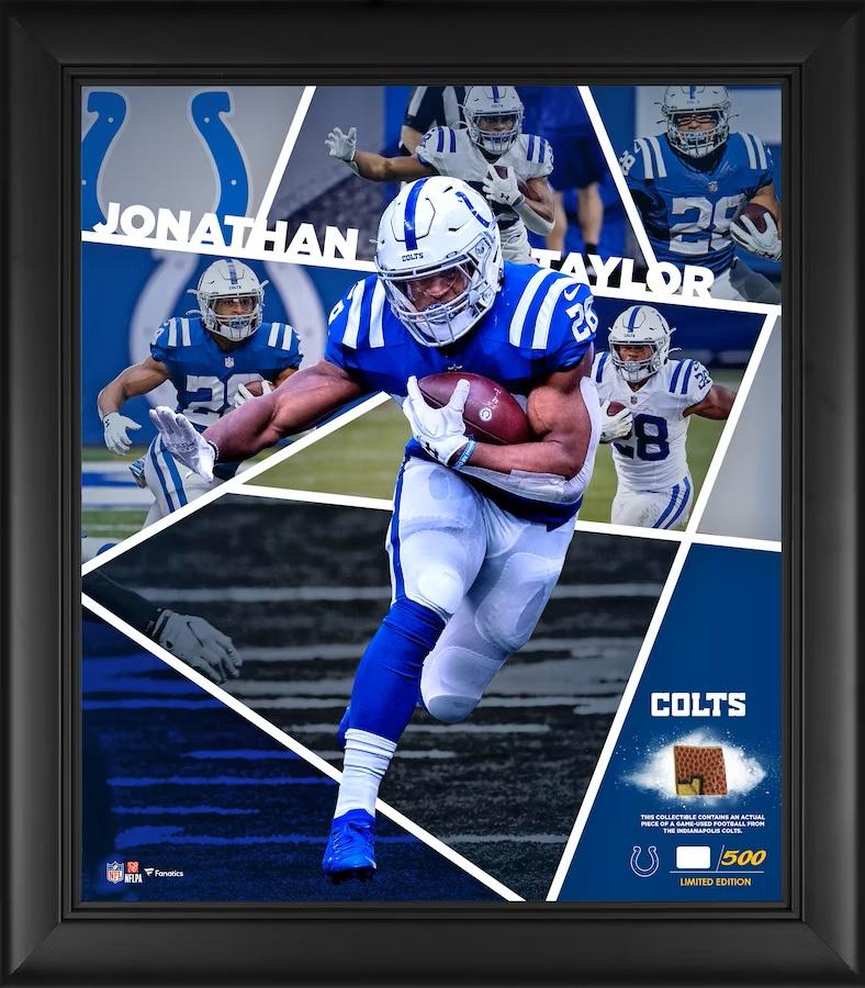 Custom frame measures 15" x 17" and features a game-used piece of football and a picture of Jonathan Taylor (Indianapolis Colts). Limited Edition to 500. The display is unsigned.