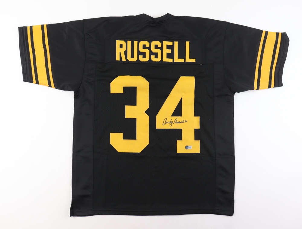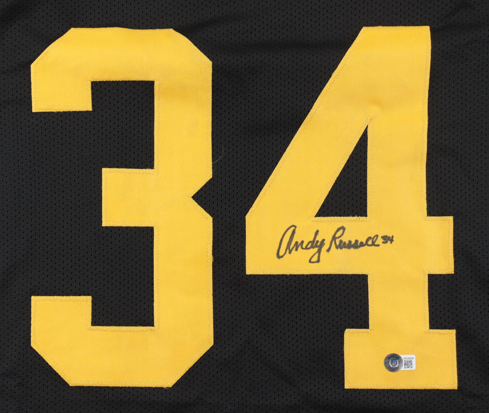 Custom jersey. Everything is sewn on, size XL. Hand-signed by Andy Russell. Please note, the signature has bled.