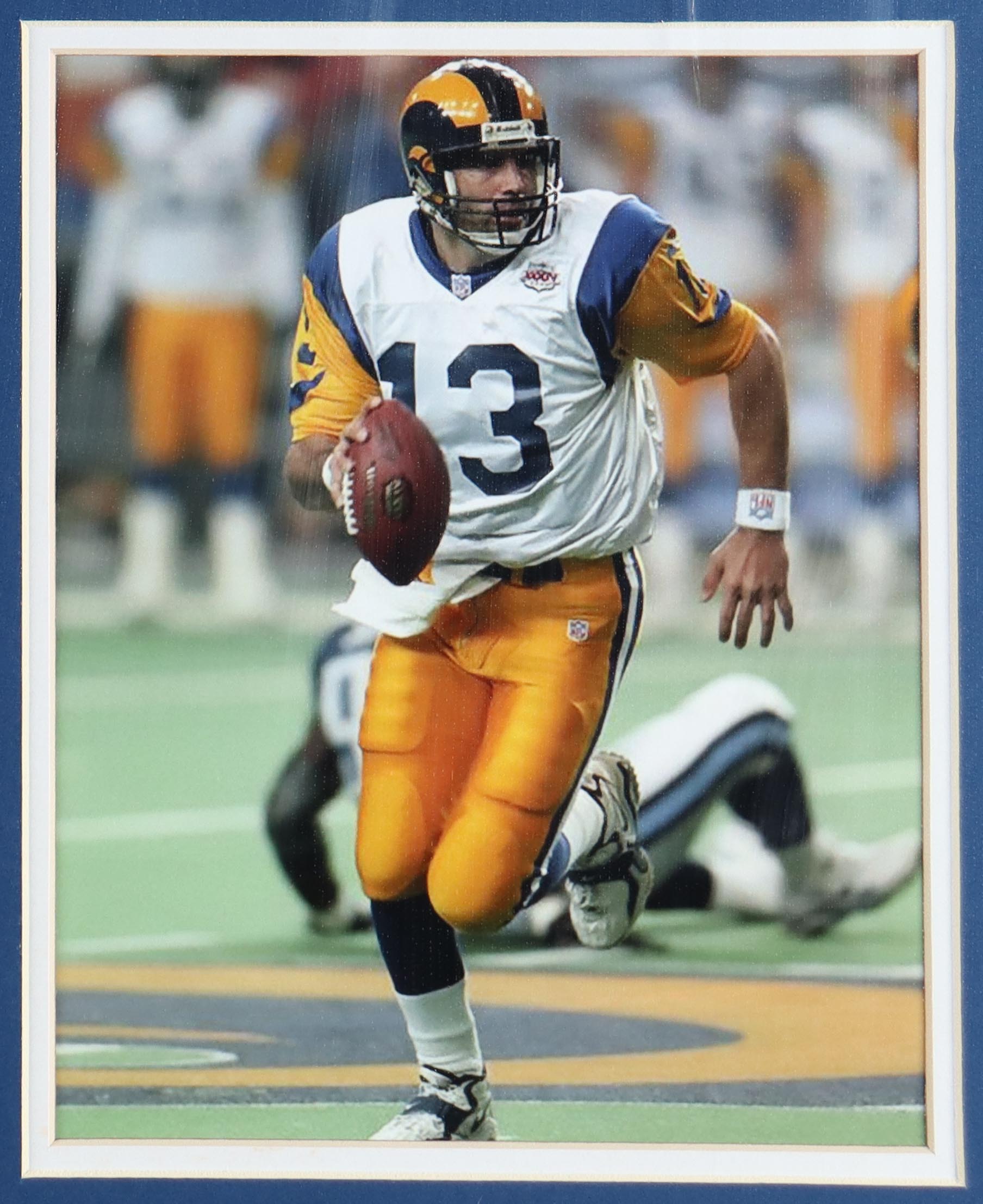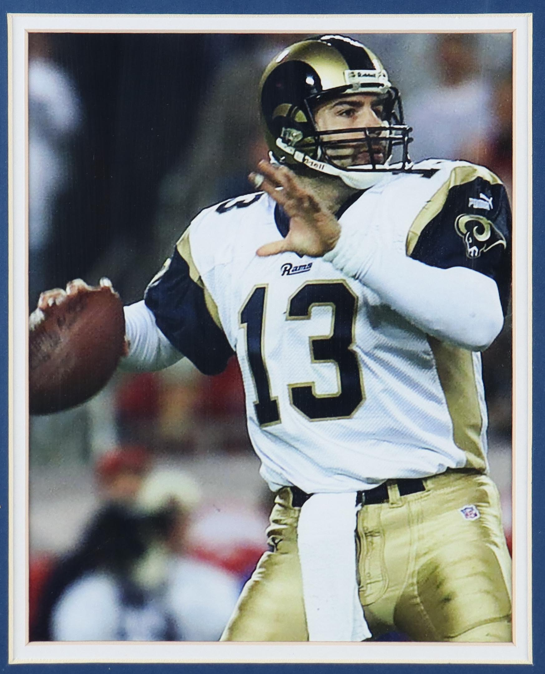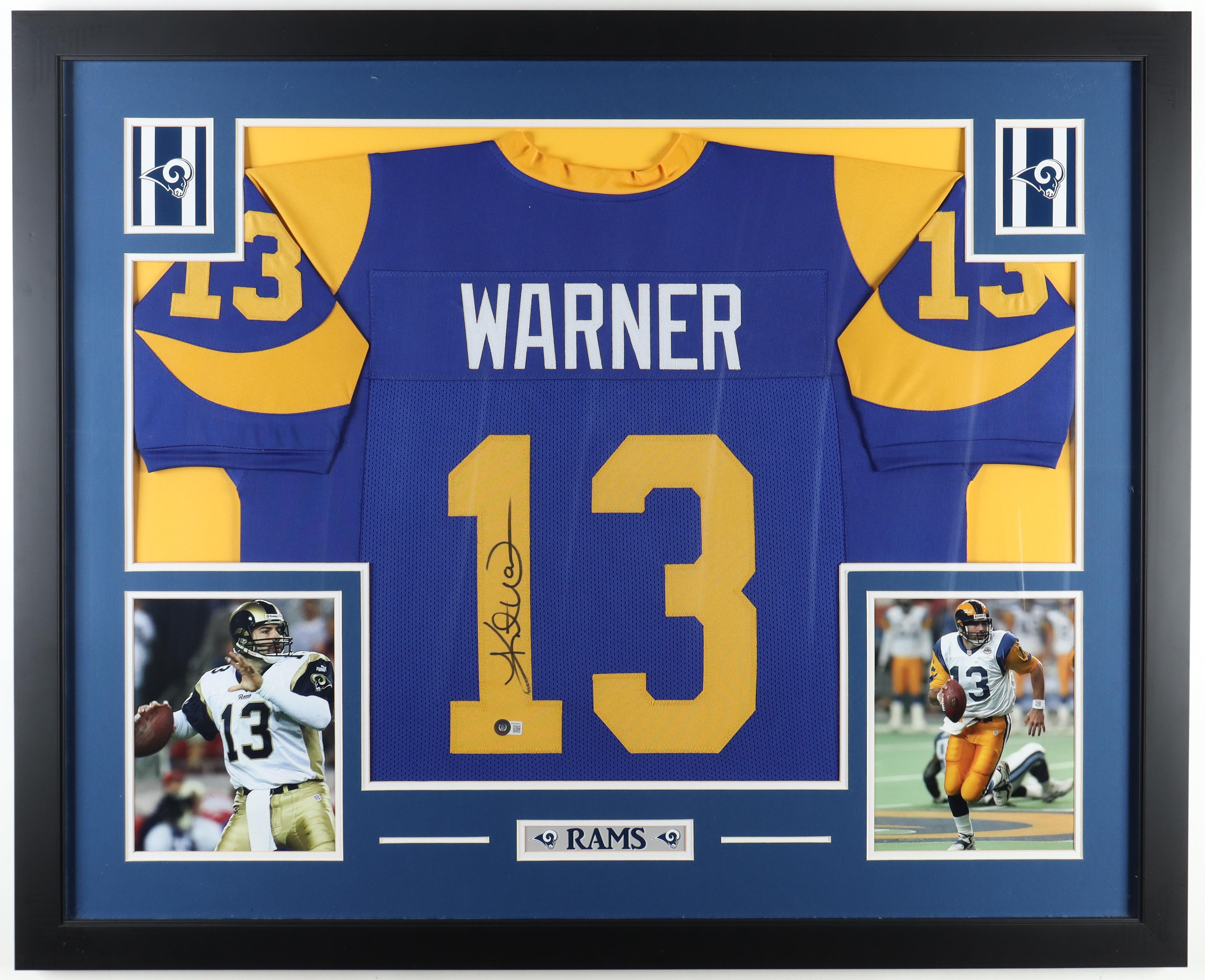 Custom frame measures 35" x 43" in size and features a jersey hand-signed by Kurt Warner (HOF).