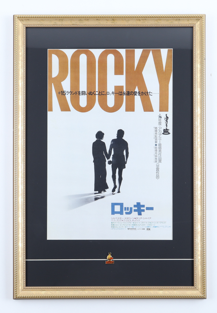 Custom frame measures approximately 17" x 25" in size and features a Vintage Japanese "Rocky" movie poster and foreign only Rocky pin. Please note, the display is unsigned.