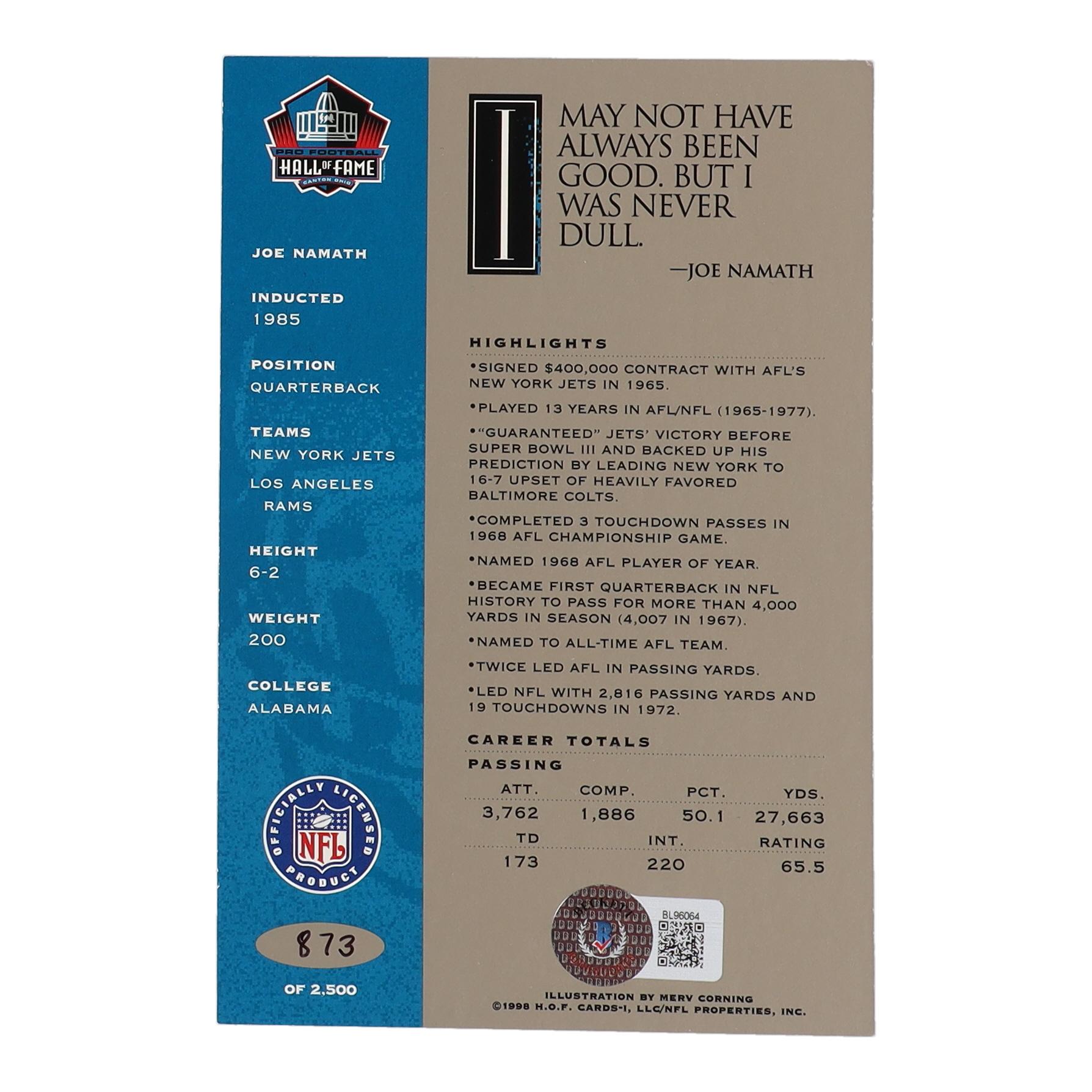 Card measures 4" x 6" in size. Hand-signed by Joe Namath (New York Jets, HOF). Limited edition hand-numbered #873/#2,500.