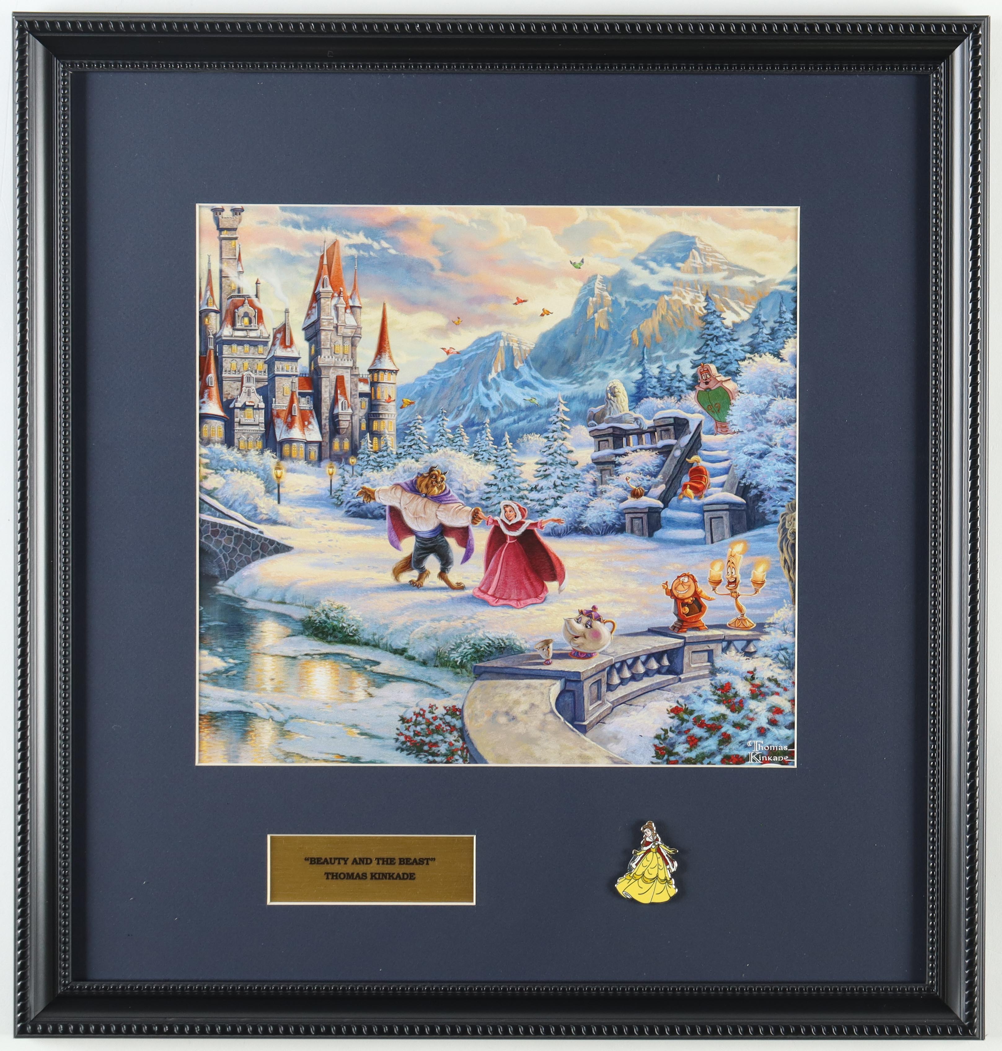 Thomas Kinkade "Beauty and the Beast" Custom Framed Print Display with Paris Exclusive "Belle" Winter Character Pin