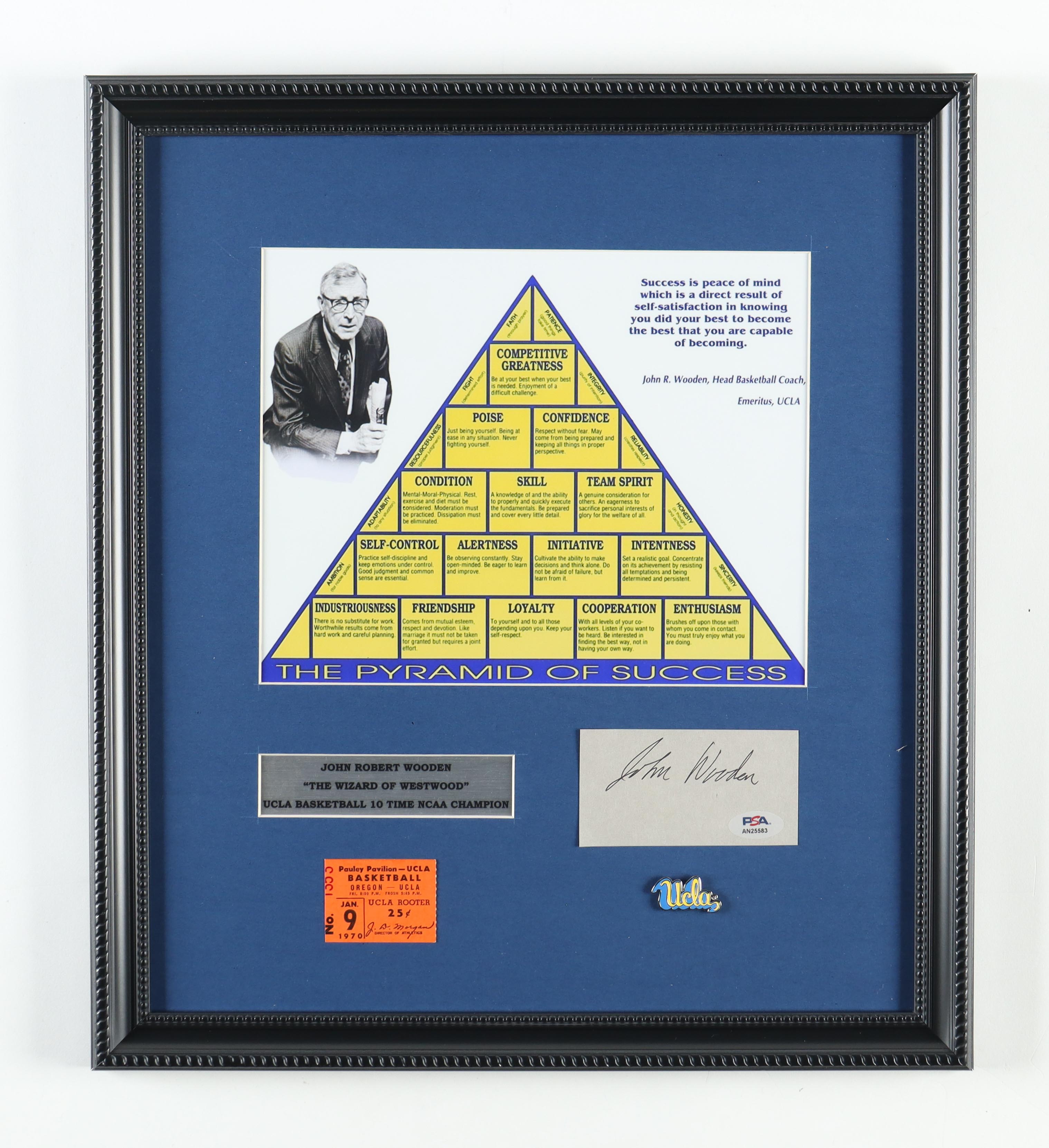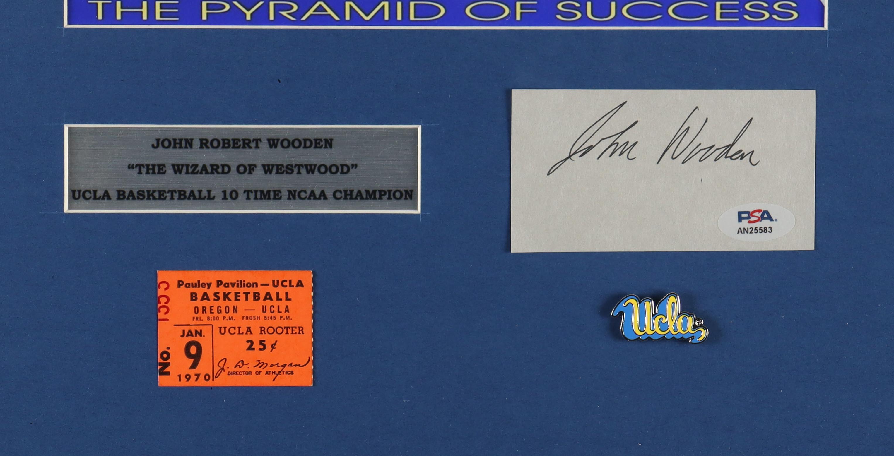 John Wooden Signed "The Pyramid of Success" Custom Framed Cut Display with 1970 UCLA Bruins Basketball Ticket & Metal Pin (PSA)