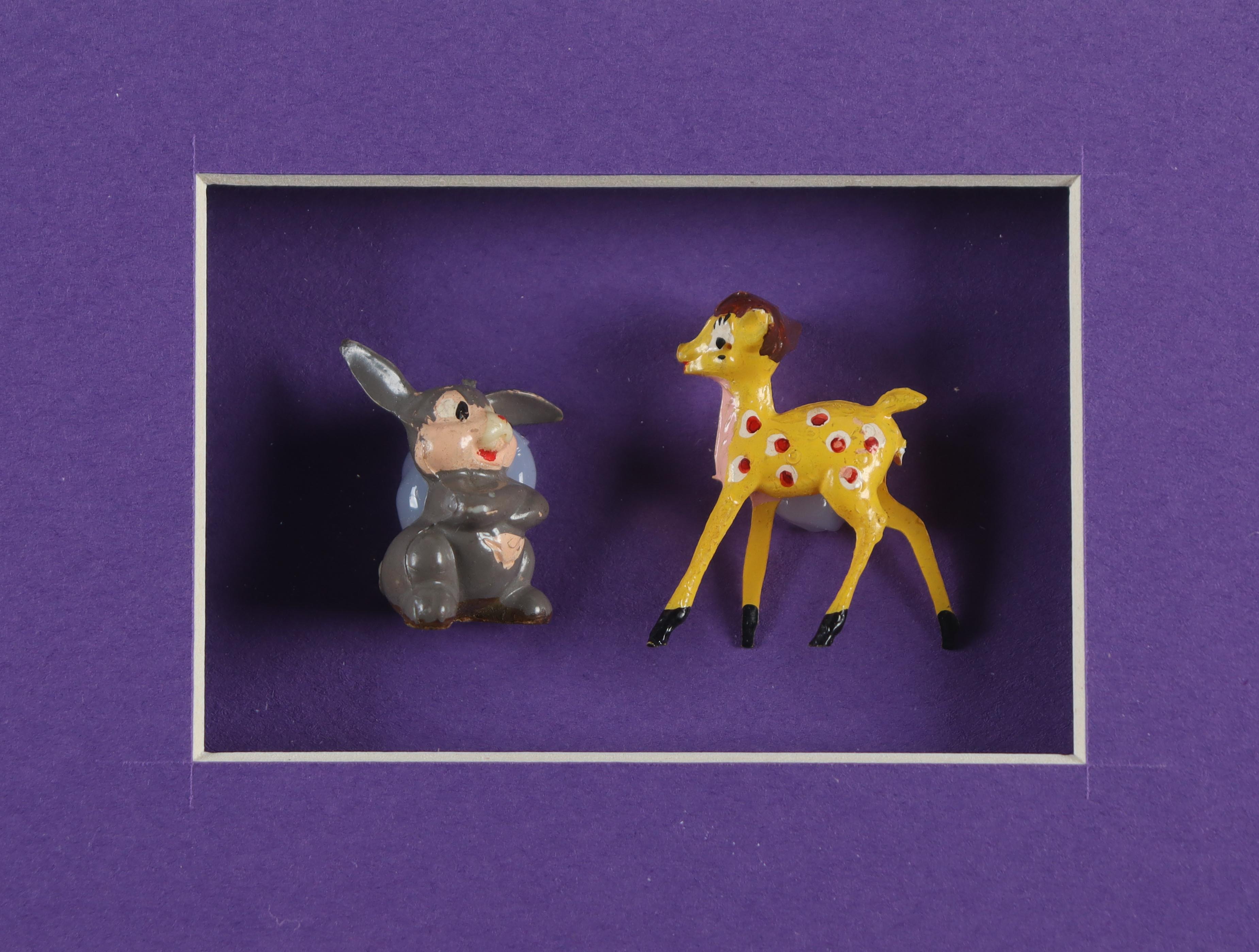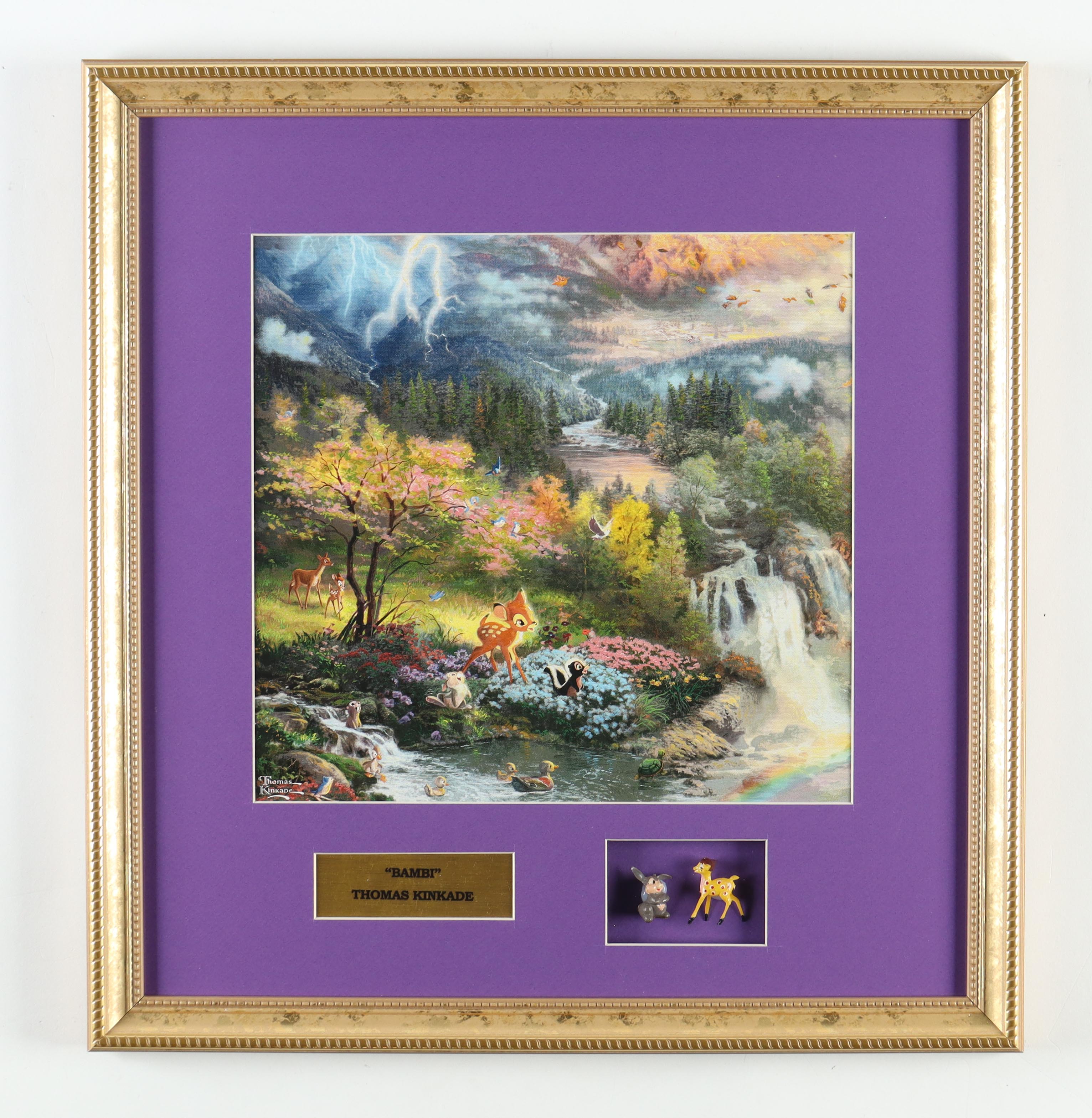 Thomas Kinkade "Bambi" Custom Framed Print with Original 1960 Disney Bambi & Thumber Small Ceramic Movie Figures