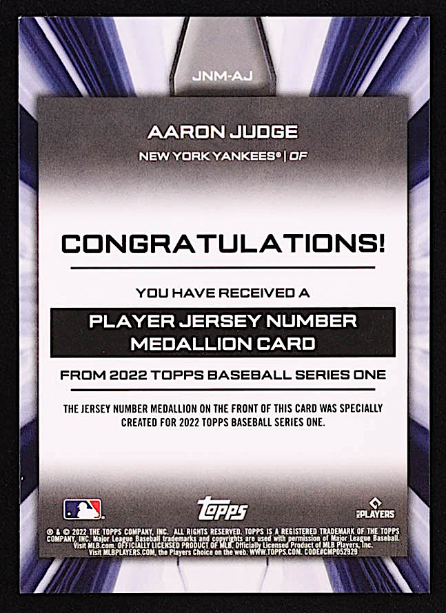 Aaron Judge 2022 Topps Commemorative Player Jersey Number Medallions #JNMAJ