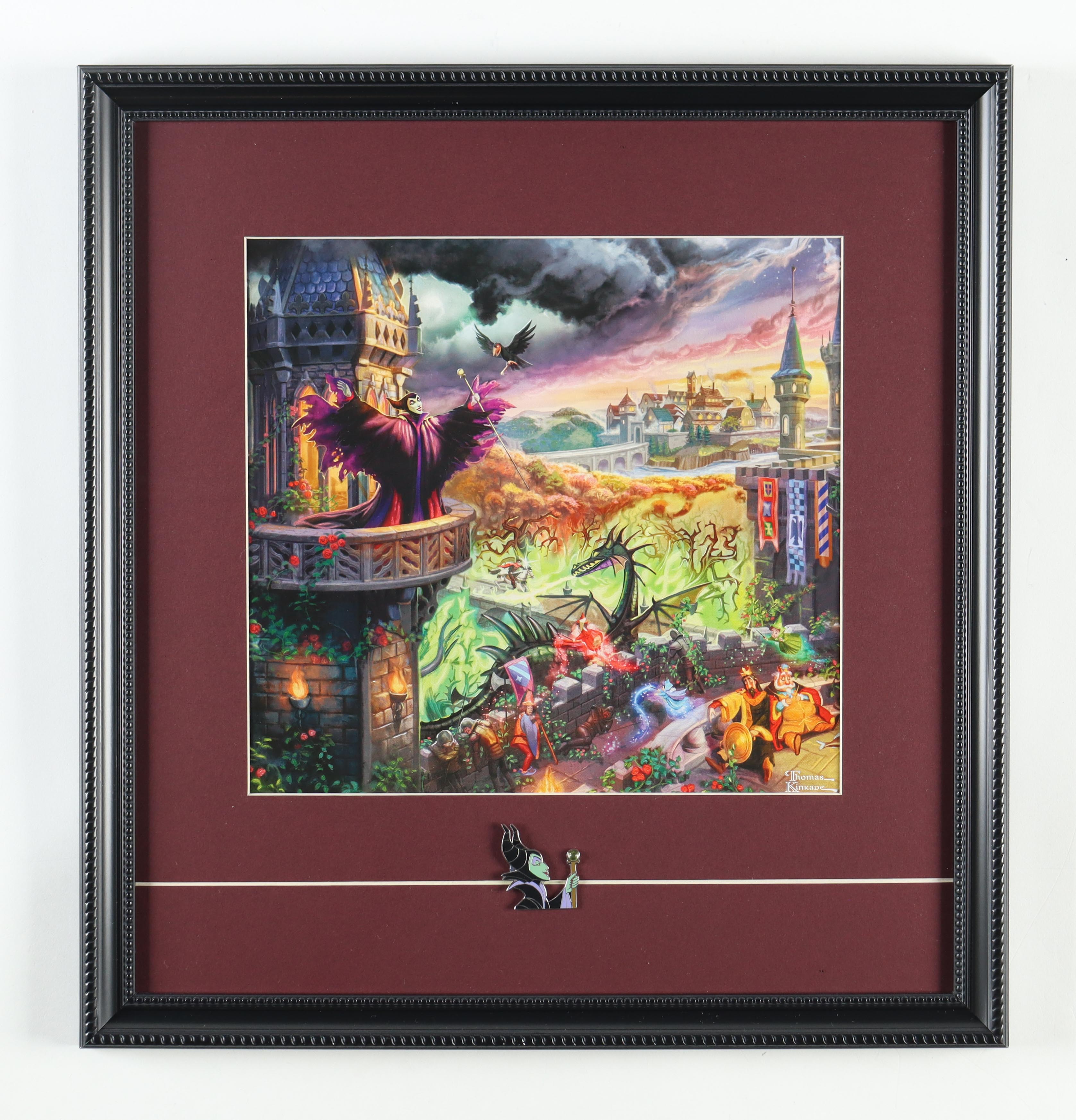 Custom frame measures approximately 18" x 19" in size. Features a Tkomas Kinkade (D. 2012) art print. Includes a Disney Maleficent with Crystal Ball Metal Pin. Please see photos for details regarding the condition of the frame.