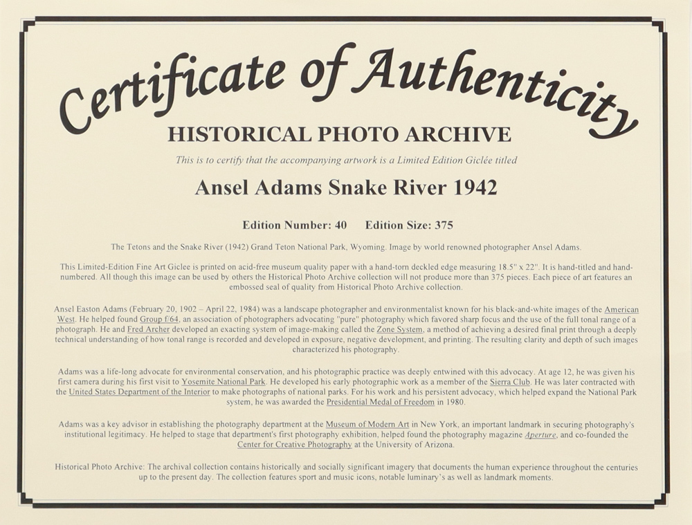 Historical Photo Archive - “Ansel Adams Snake River ” Limited Edition 18.25x22 Fine Art Giclee on Paper #/375