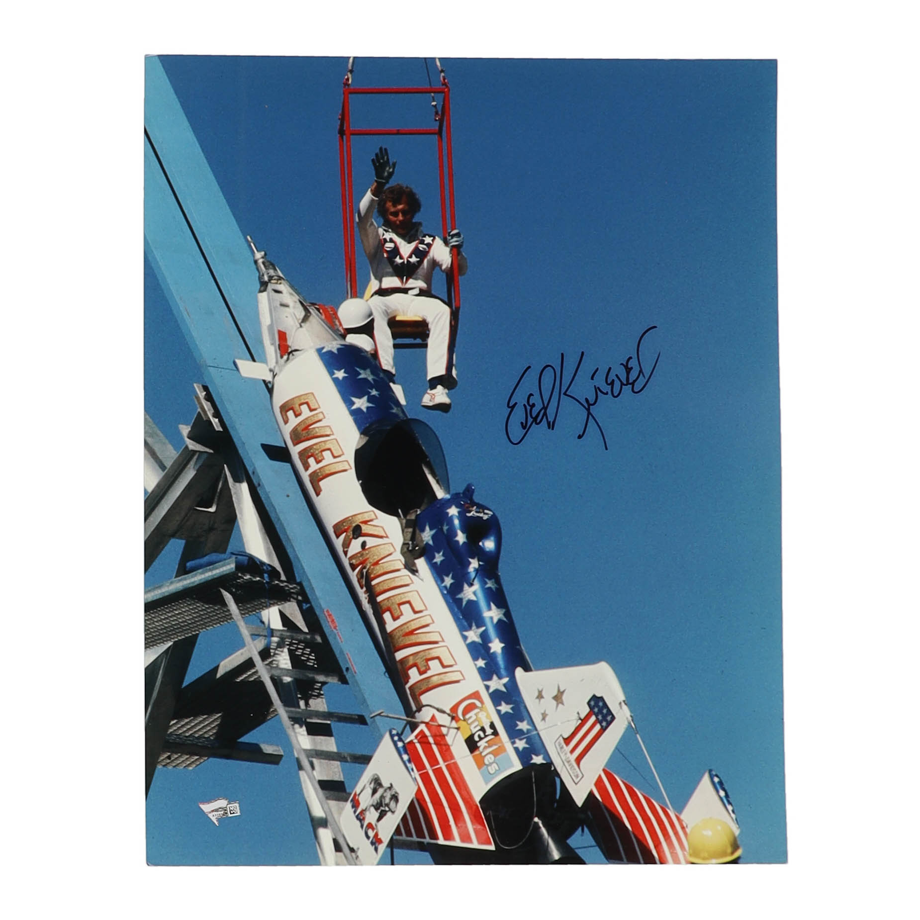 Photo measures 16" x 20" in size and has been hand-signed by Evel Knievel (D. 2007).