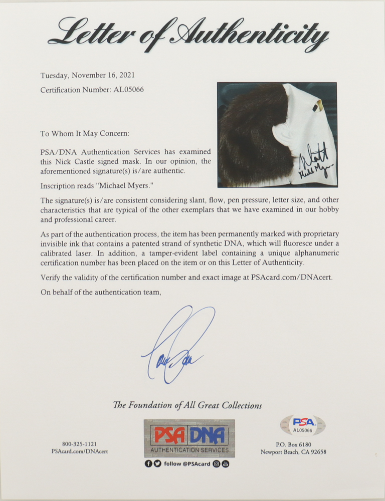 Full-size latex Michael Myers mask is hand-signed and inscribed by Nick Castle.