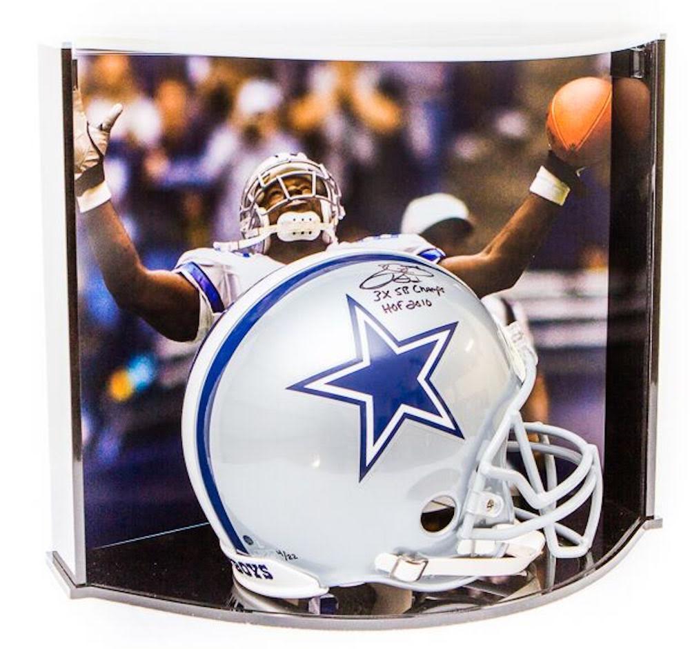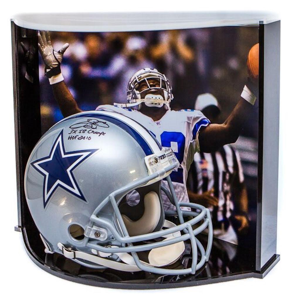 Overall, the display case has an approximate size of 19.875" wide x 16" high x 12.25" deep and weighs 9 lbs. Carefully packed inside a protective box for shipment are the display's base, two clear acrylic covers, lid, two side panels, brace, 4 screws, and a "game item" holder. This custom designed helmet and case is a must have for any sports fan. Please note, some minor assembly is required.