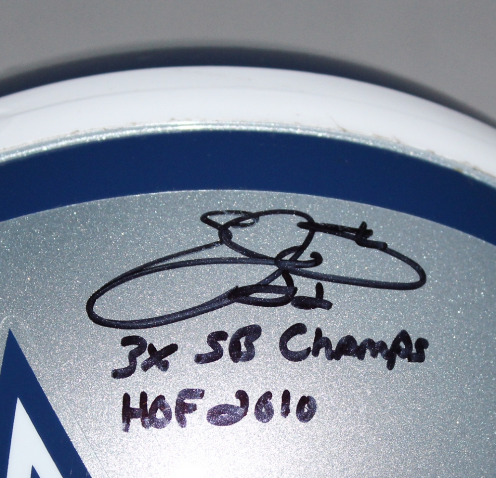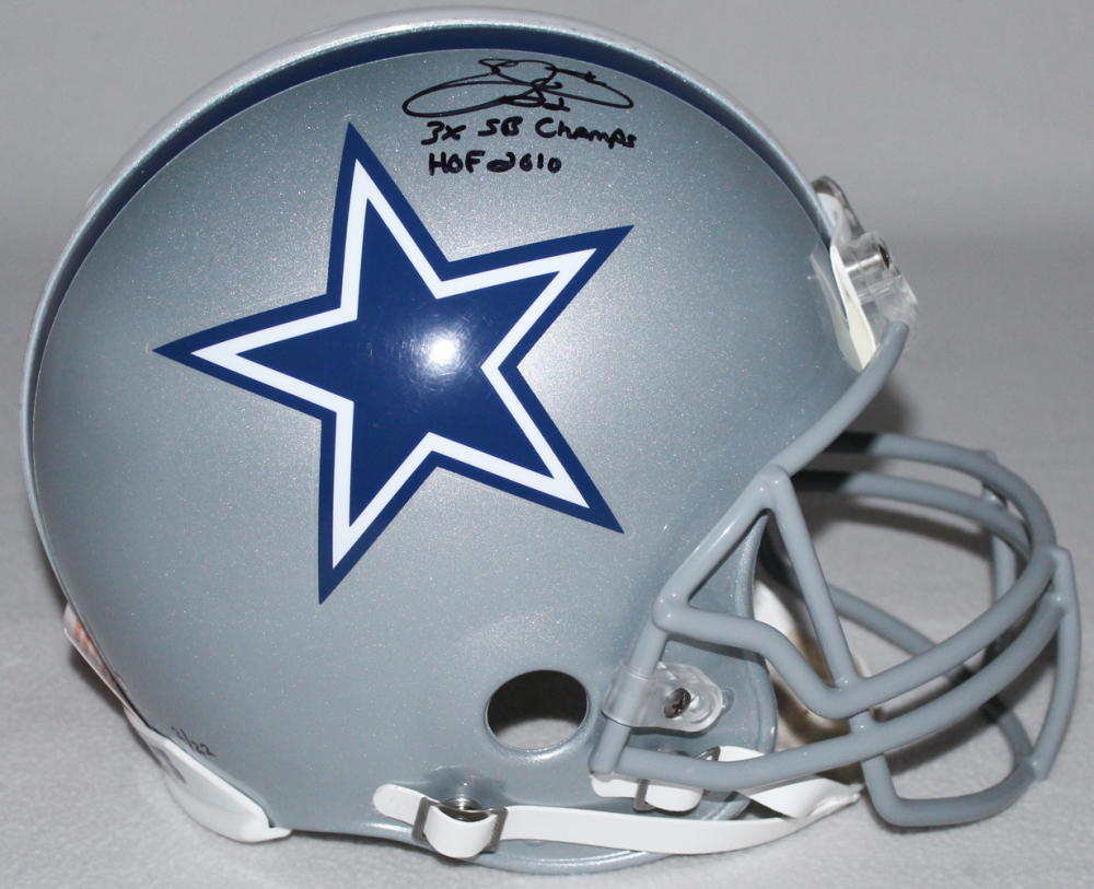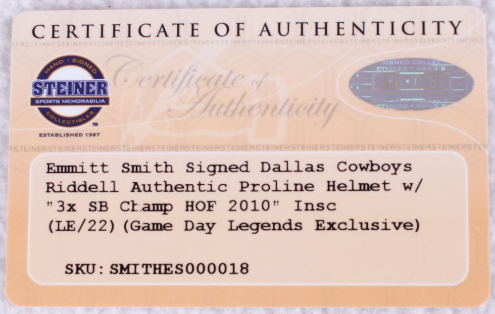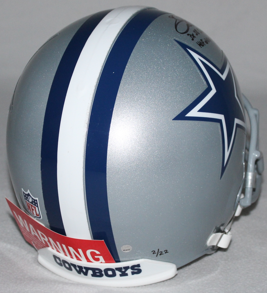Dallas Cowboys full-size authentic pro-line helmet has been hand-signed and inscribed in black felt-tip pen by Emmitt Smith (HOF). Helmet is limited edition and has been hand-numbered out of 22. Please note, you are bidding on a random edition number. The images shown are stock images from the same edition run.