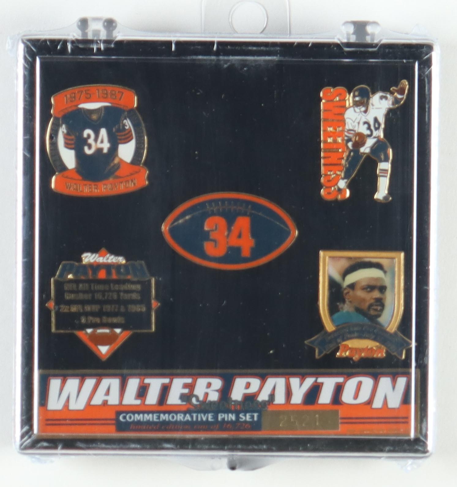Walter Payton Chicago Bears "Sweetness" commemorative pin set includes (5) pins. Includes display case as shown. Pin set is limited edition and has been numbered #/16,726.