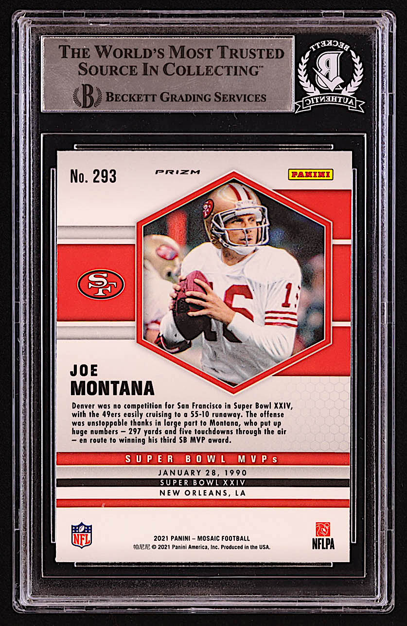 Joe Montana Signed Sticker on 2021 Panini Mosaic Mosaic Green #293 MVP (BGS)