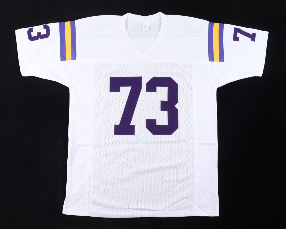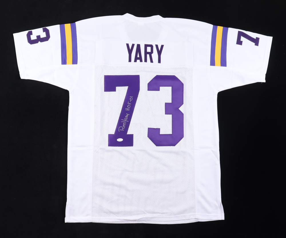 Custom jersey. Everything sewn on, size XL. Hand-signed and inscribed by Ron Yary (HOF).