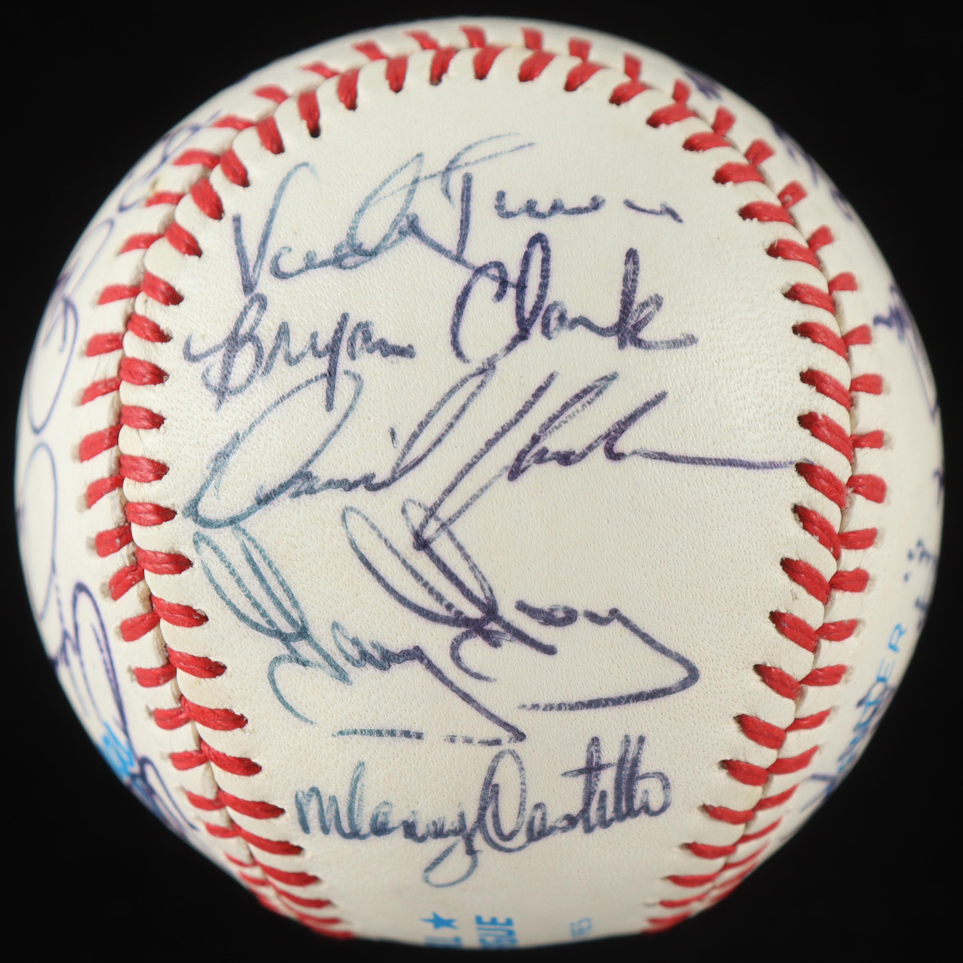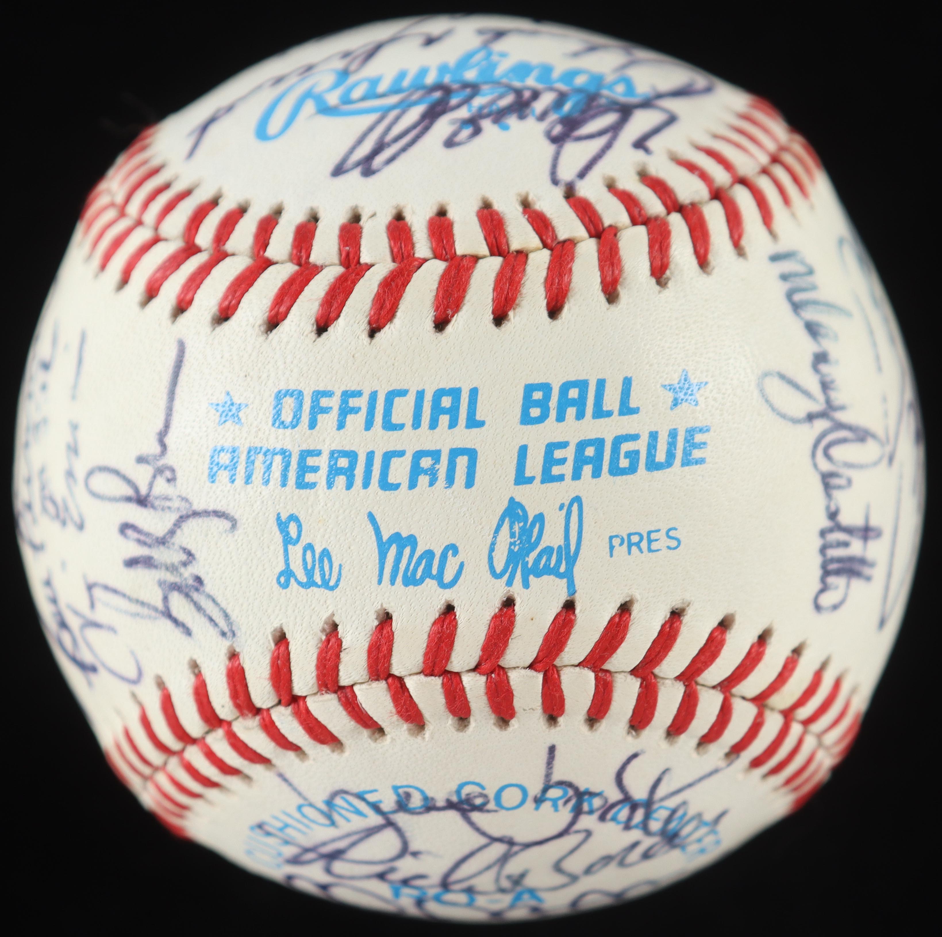Rawlings Official American League baseball 1982 Seattle Mariners team-signed by (28) with Gaylord Perry, Vada Pinson, Larry Anderson, Floyd Bannister, Jim Beattie, Bruce Bochte, Rich Bordi, Bobby Brown, Manny Castillo, Bryan Clark, Chuck Cottier, Bill Coughlin, Al Cowens, Dave Duncan, Dave Elder, Jim Essian, Gary Gray, Dave Henderson, Rene Lachemann, Orlando Mercado, Mike Moore, John Moses, Ron Musselman, Bill Plummer, Paul Serna, Bob Stoddard, Richie Zisk. Please note, the baseball is naturally toned and the signatures are fading and the display case is included with the Mariners Pin