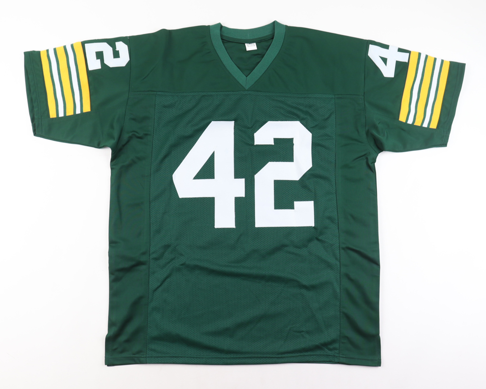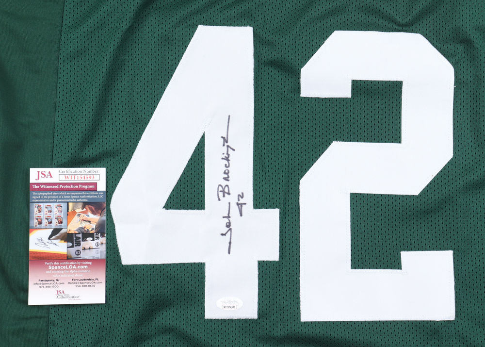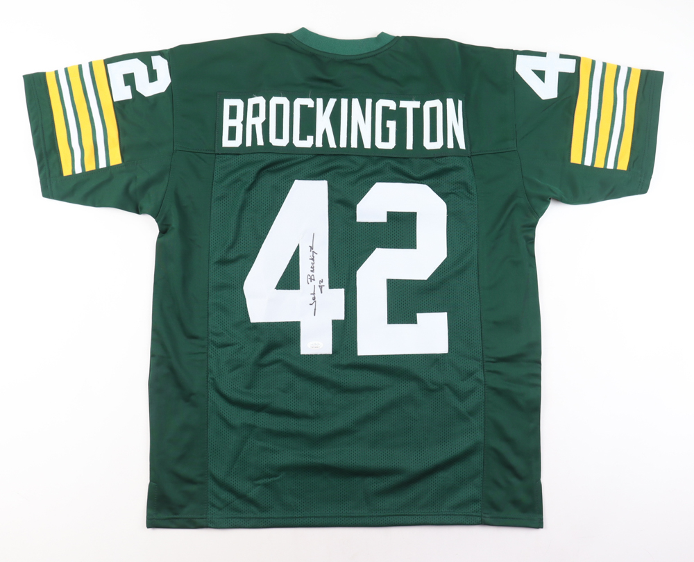 Custom jersey. Everything sewn on, size XL. Hand-signed by John Brockington.