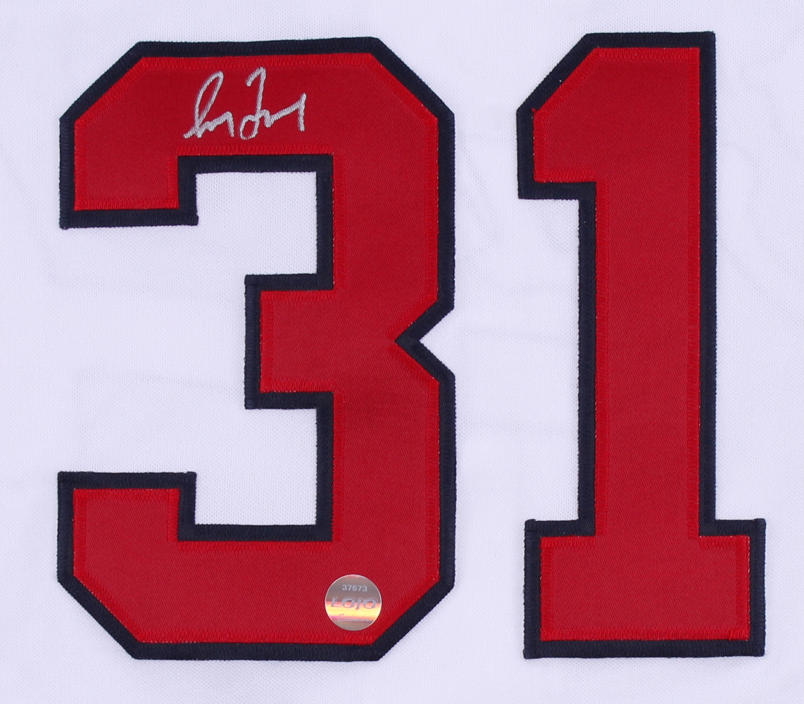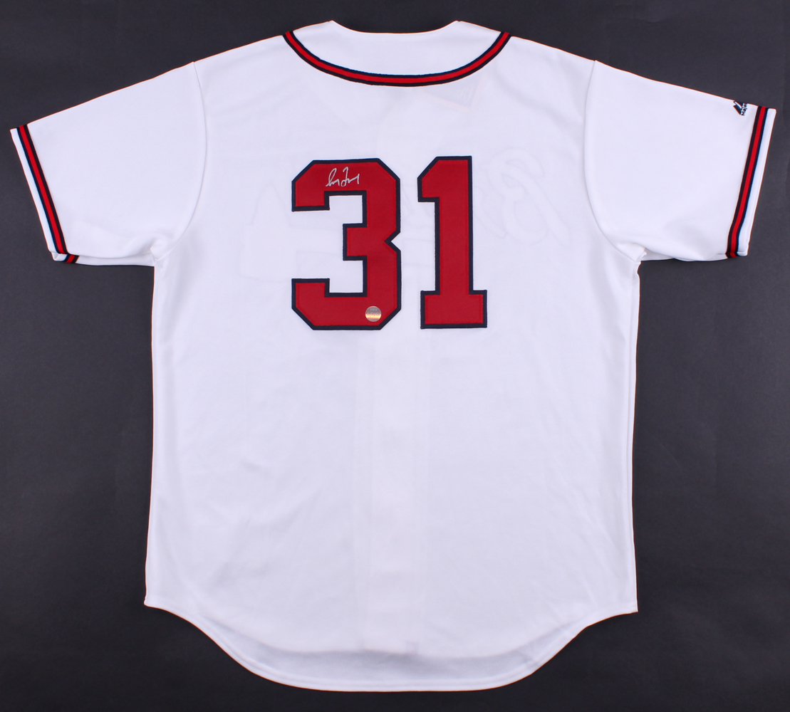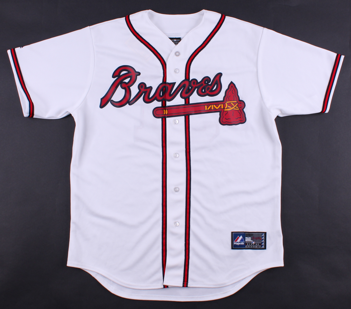 Majestic Cooperstown Collection on-field style jersey. Everything is sewn on, size L. Hand-signed in silver paint pen by Greg Maddux.