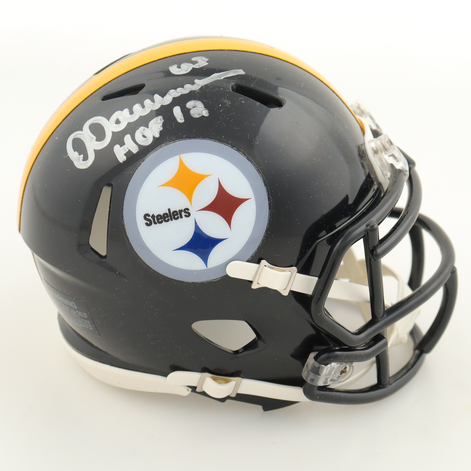 Riddell Pittsburgh Steelers mini helmet. Hand-signed and inscribed by Dermontti Dawson (HOF).