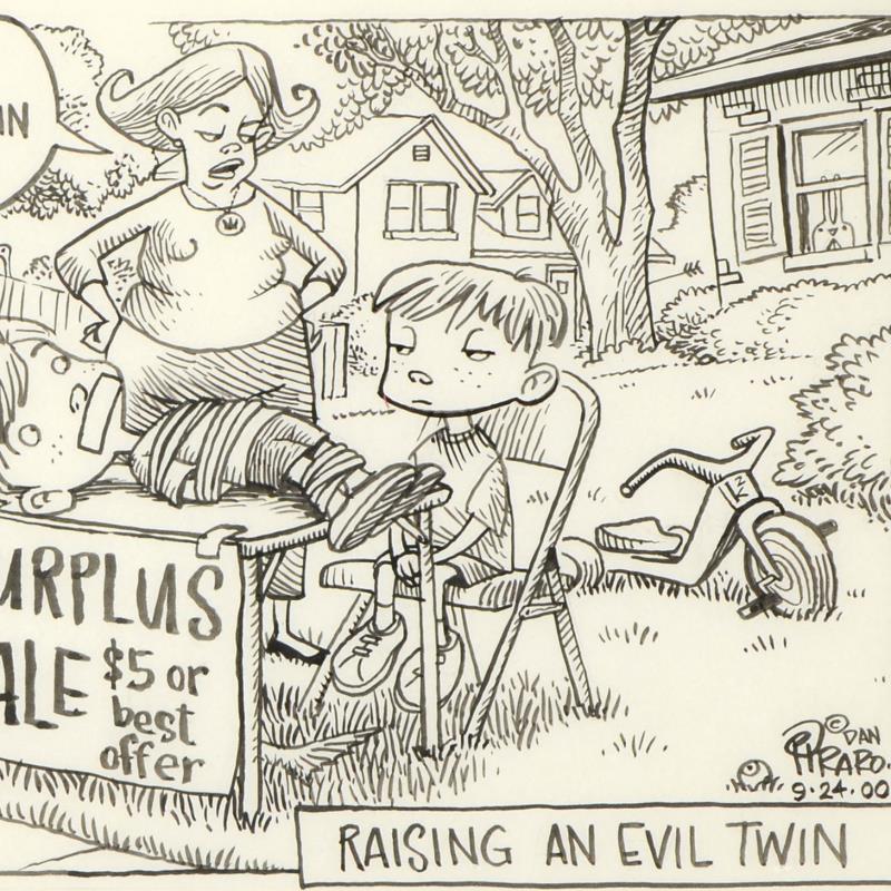 Enter a surreal and satirical world of twisted imagination and award winning creativity. "Raising an Evil Twin" is an original pen & ink drawing on paper by Dan Piraro, creator of the critically acclaimed and award winning comic strip, Bizarro. This piece is hand signed and comes framed. Includes Letter of Authenticity! Measures approx. 20.5" x 14.5" (frame), 13" x 7" (image).
