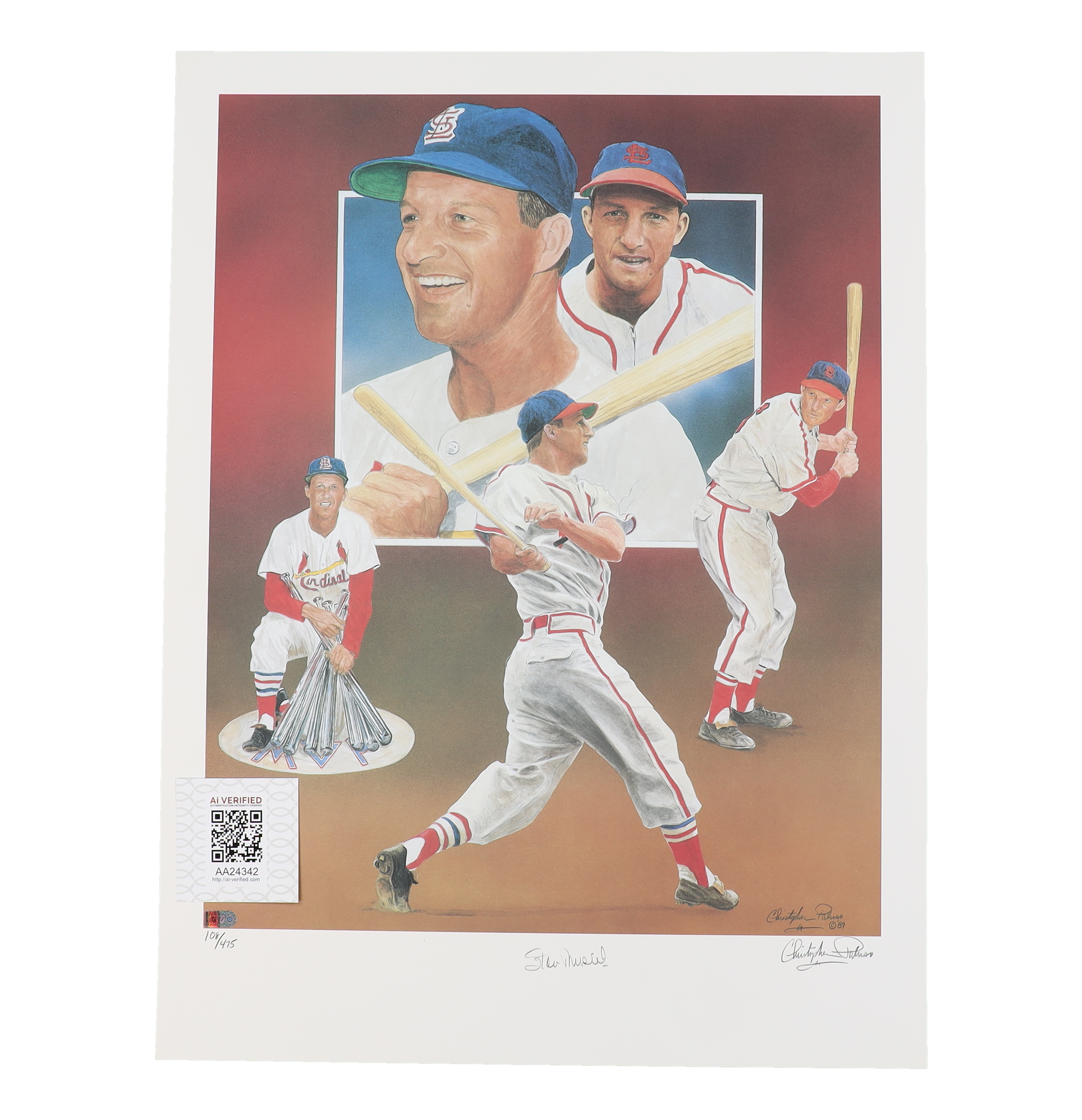 Print measures 18" x 24" in size. Hand-signed by Stan Musial (D. 2013, St. Louis Cardinals, HOF) and the artist, Christopher Paluso. Limited edition hand-numbered #108/475.