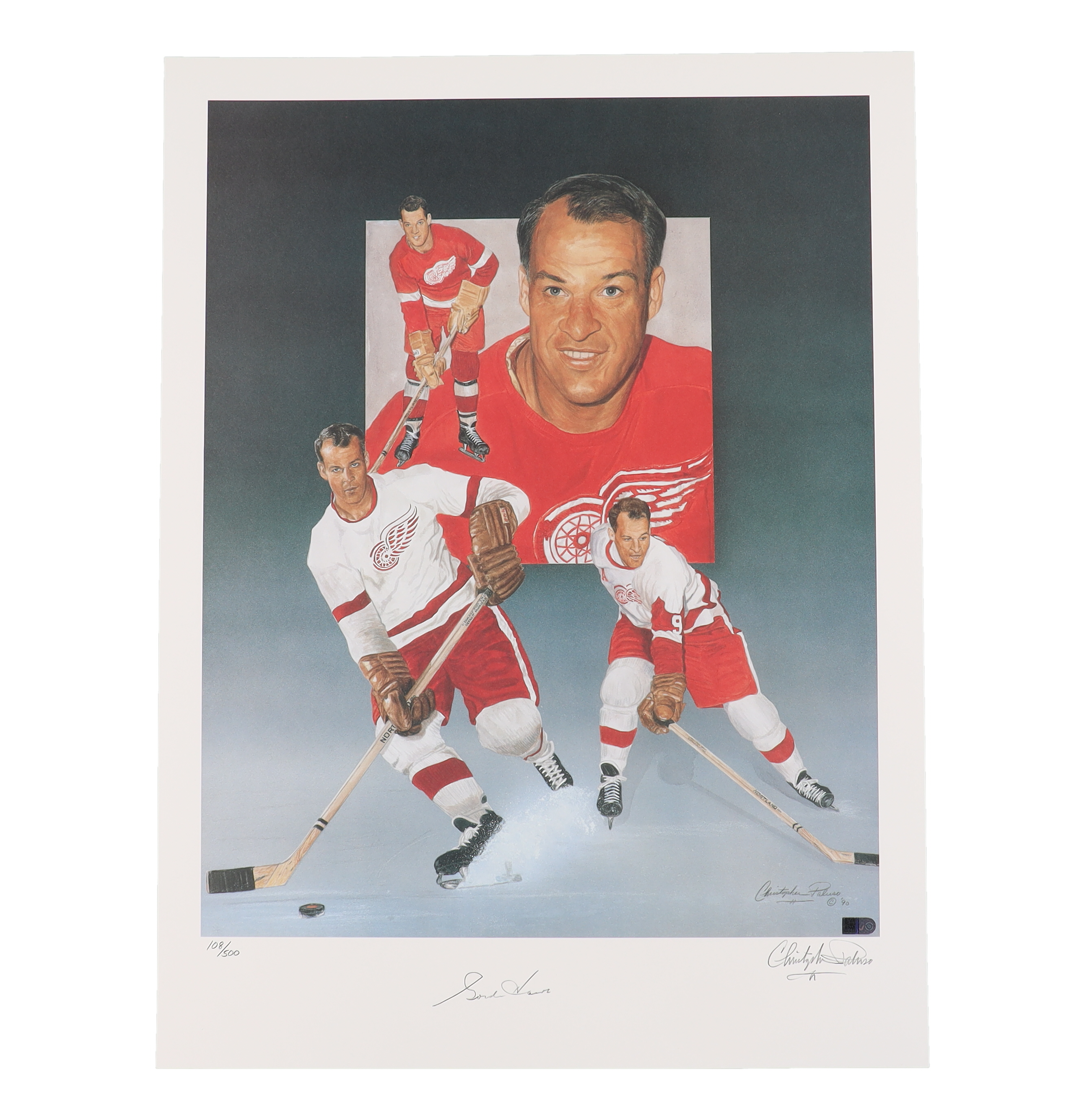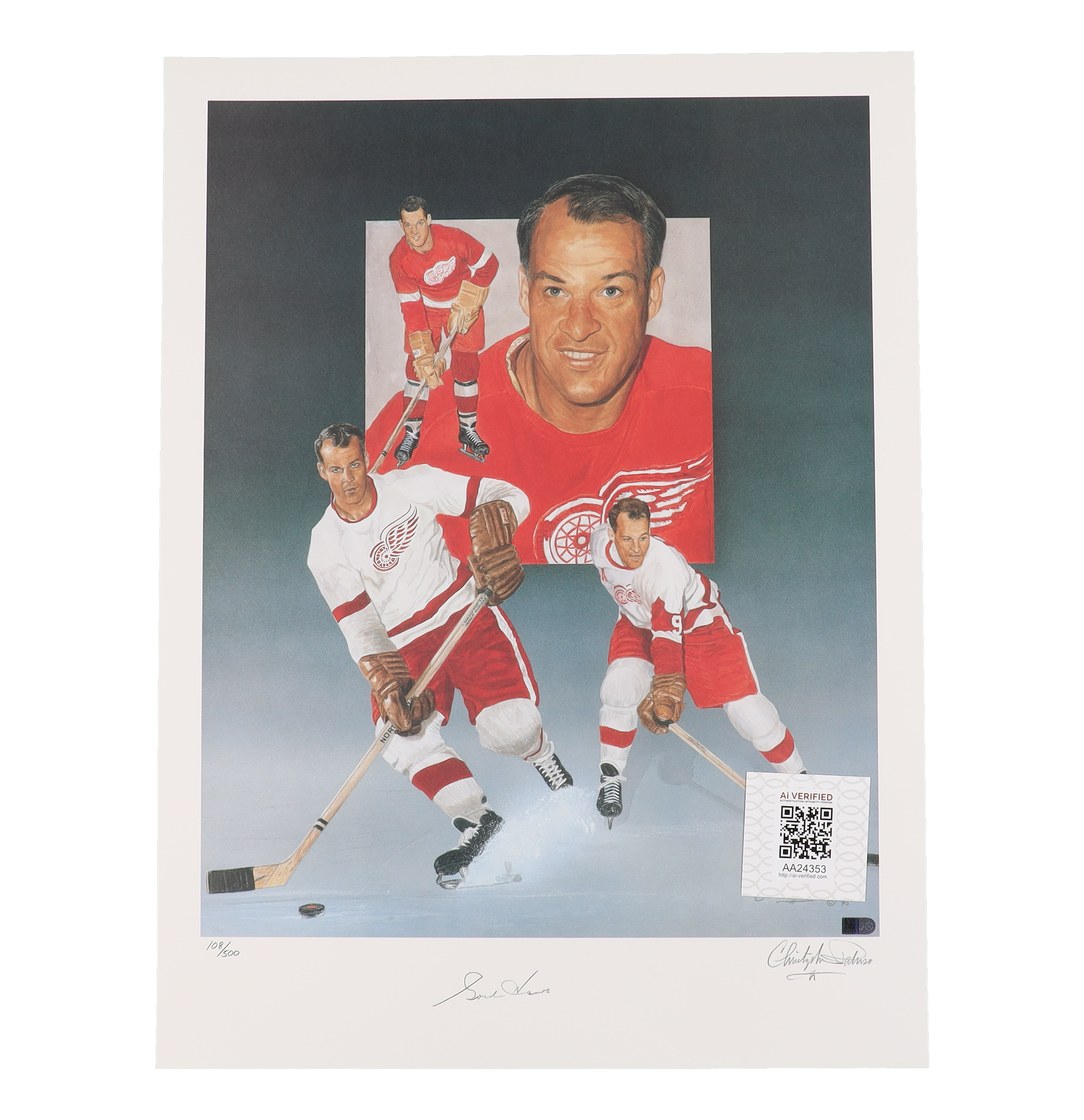 Print measures 18" x 24" in size. Hand-signed by Gordie Howe (D. 2016, Detroit Red Wings, HOF) and the artist, Christopher Paluso. Limited edition hand-numbered #108/500.