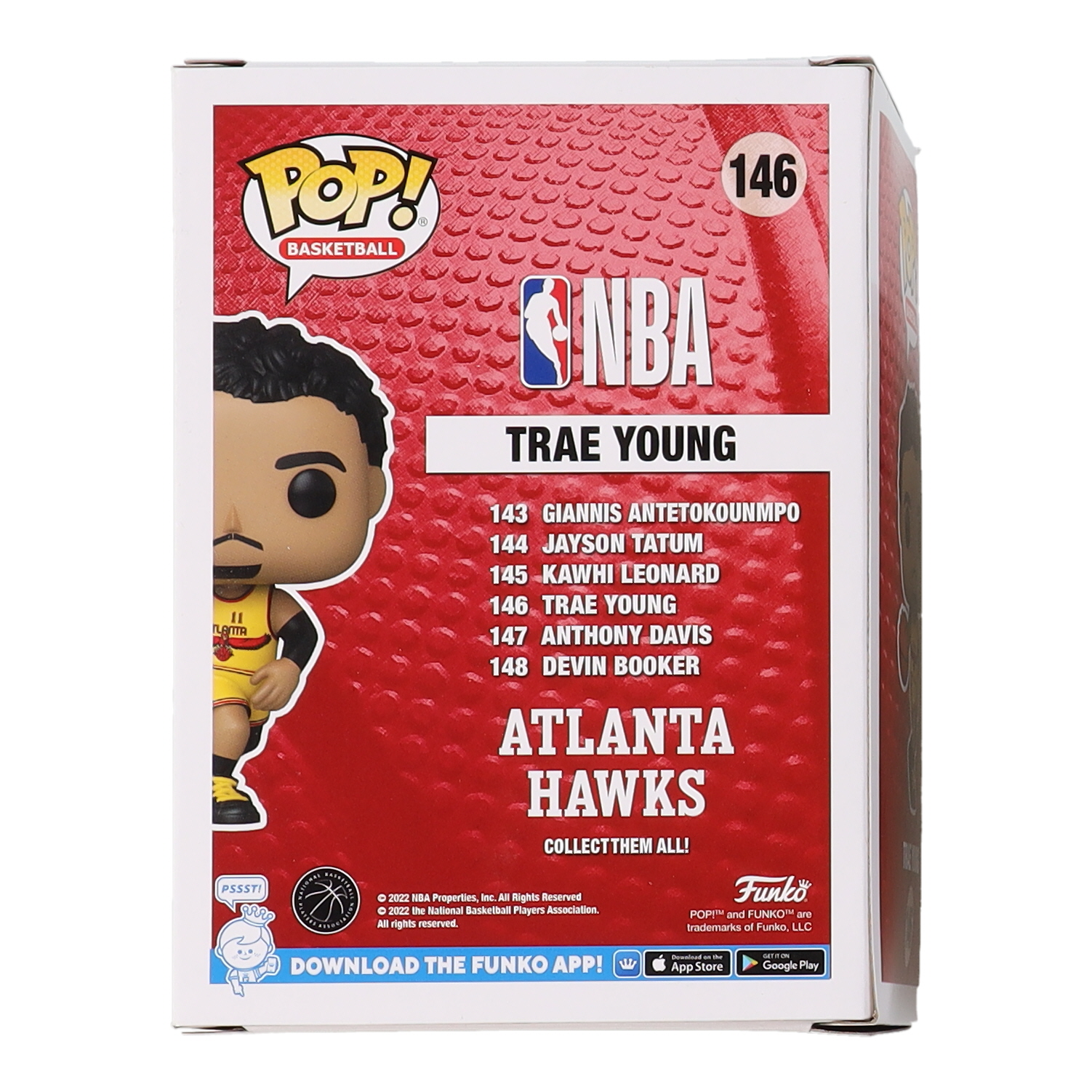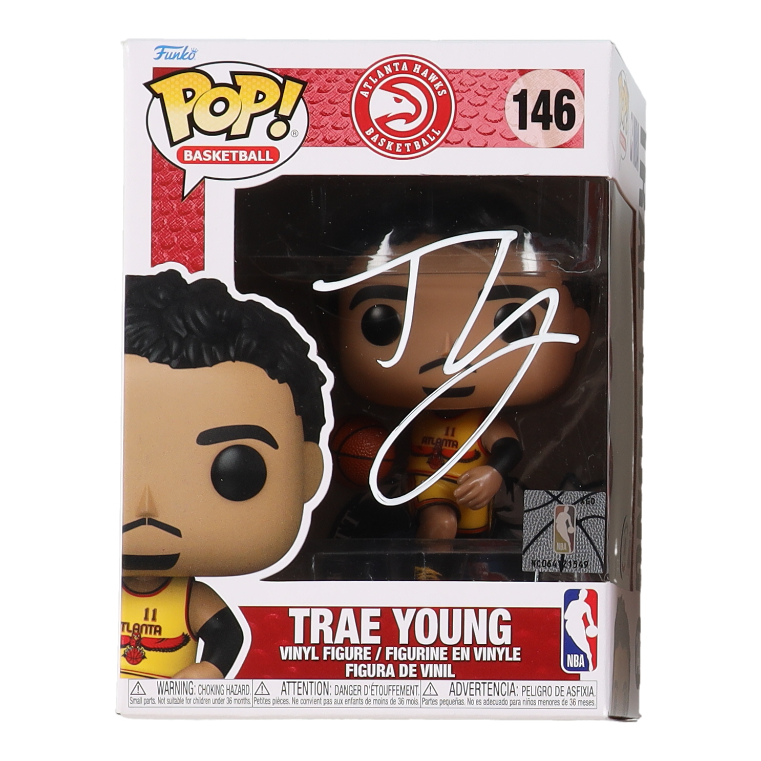 Funko Pop! vinyl figure measures approximately 4" tall. Hand-signed on the packaging by Trae Young (Atlanta Hawks).