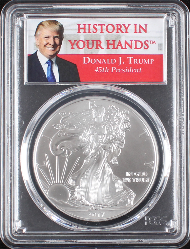 2017 $1 Silver American Eagle Coin with a Donald Trump "History In Your Hands" Label (PCGS MS69)
